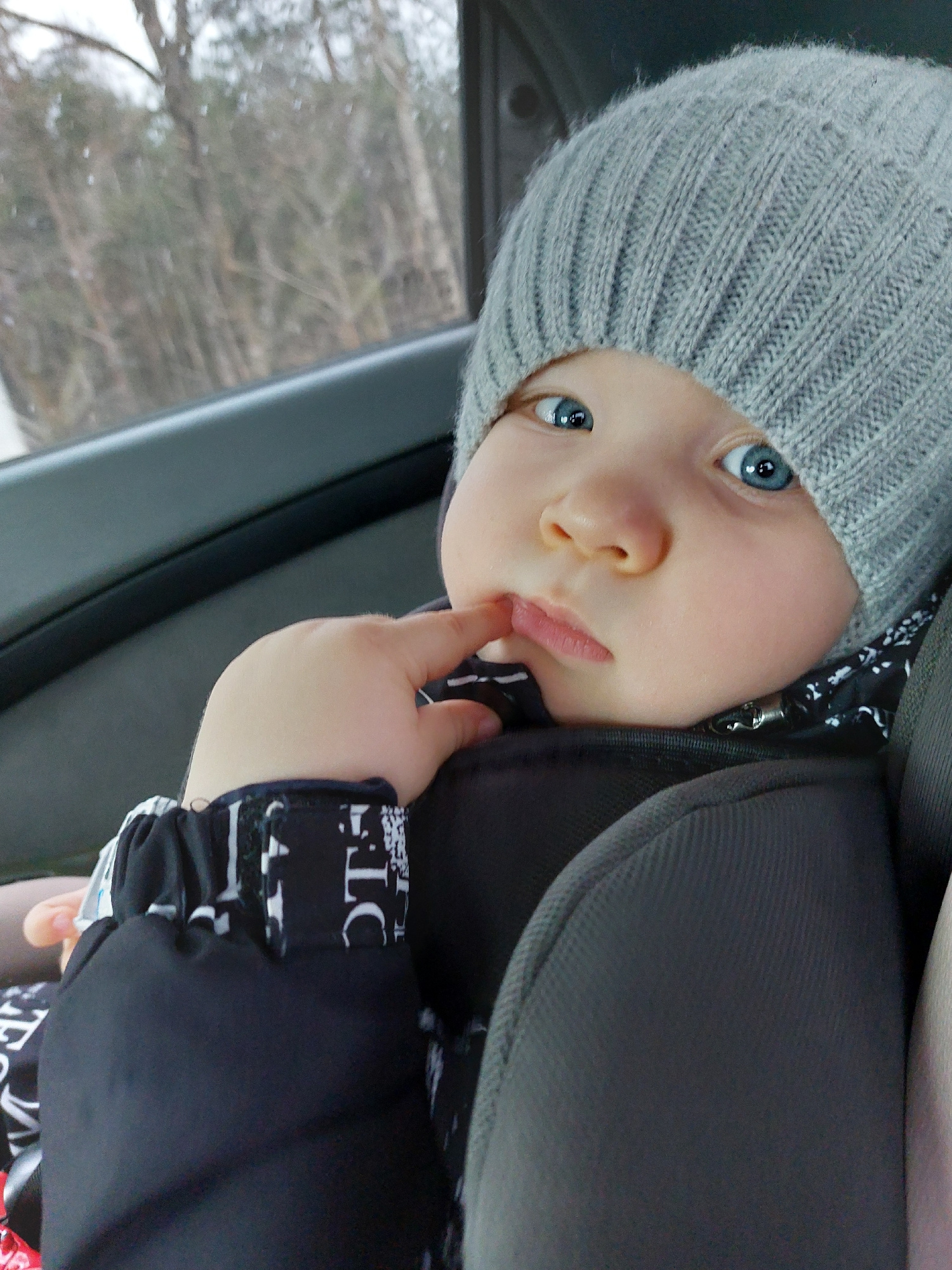A young child with blue eyes and a gray knitted hat sits in a car seat. The child is wearing a black and white patterned garment and is touching their lips with their fingers. The car window shows an…read more