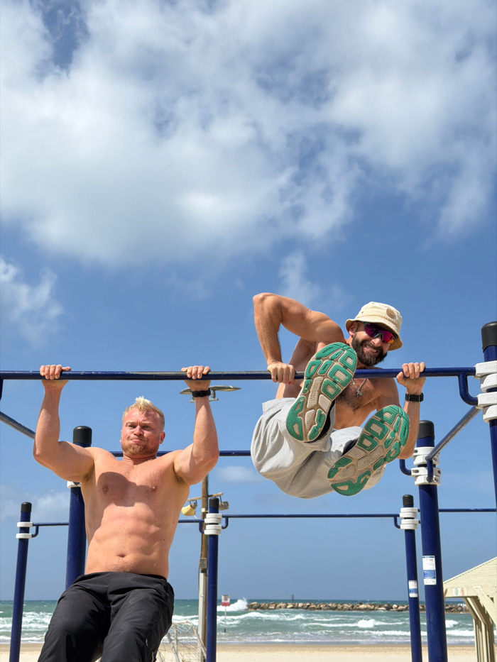 The image displays two adult males performing calisthenics on a blue metal fitness rig situated on a sandy beach in Tel Aviv, Israel. The location is characterized by a sandy shoreline transitioning i…read more