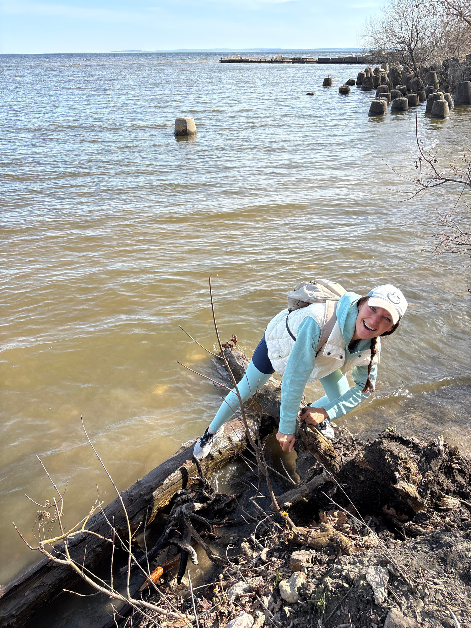 A young woman is captured smiling cheerfully at the muddy bank of a wide river, likely in Ulyanovsk, Russia, on a bright, sunny day. The image is taken at a diagonal angle, making the horizon appear t…read more