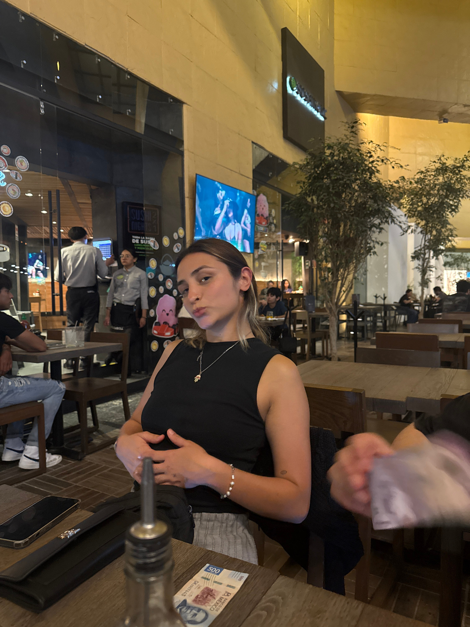 A woman with blonde hair is sitting at a restaurant table. She wears a black tank top. The setting appears to be in Puebla, Mexico, with a Mexican 500-peso note visible on the table. A black purse is…read more