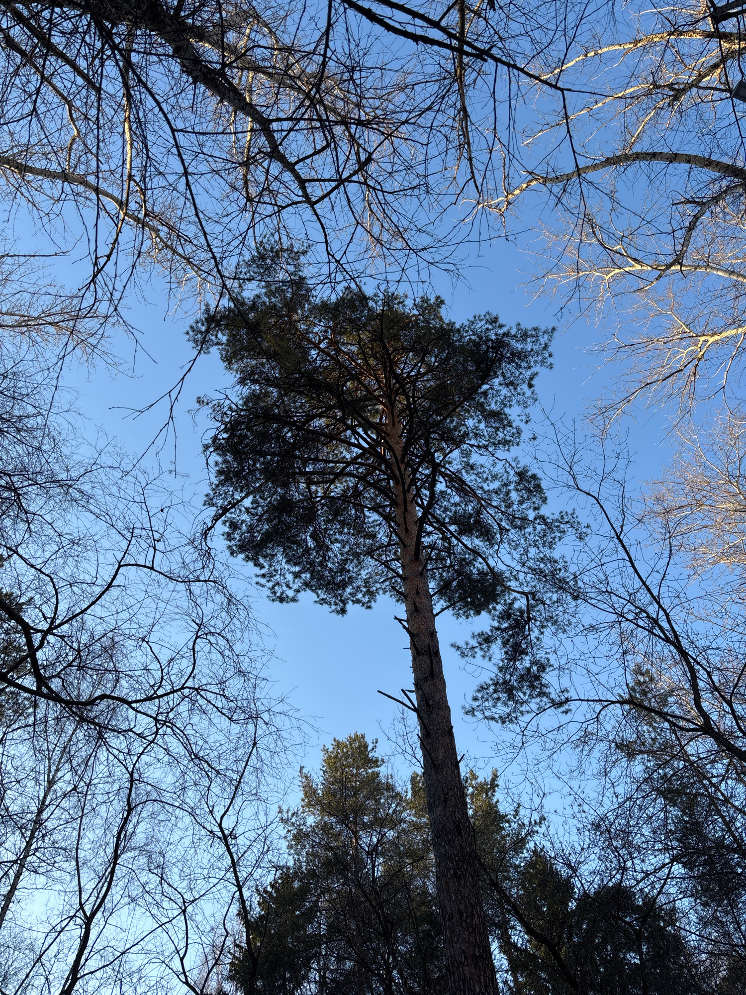 The image shows a view looking up into the sky through a dense network of tree branches. There are both coniferous and deciduous trees present. The deciduous trees are bare, suggesting a winter or ear…read more