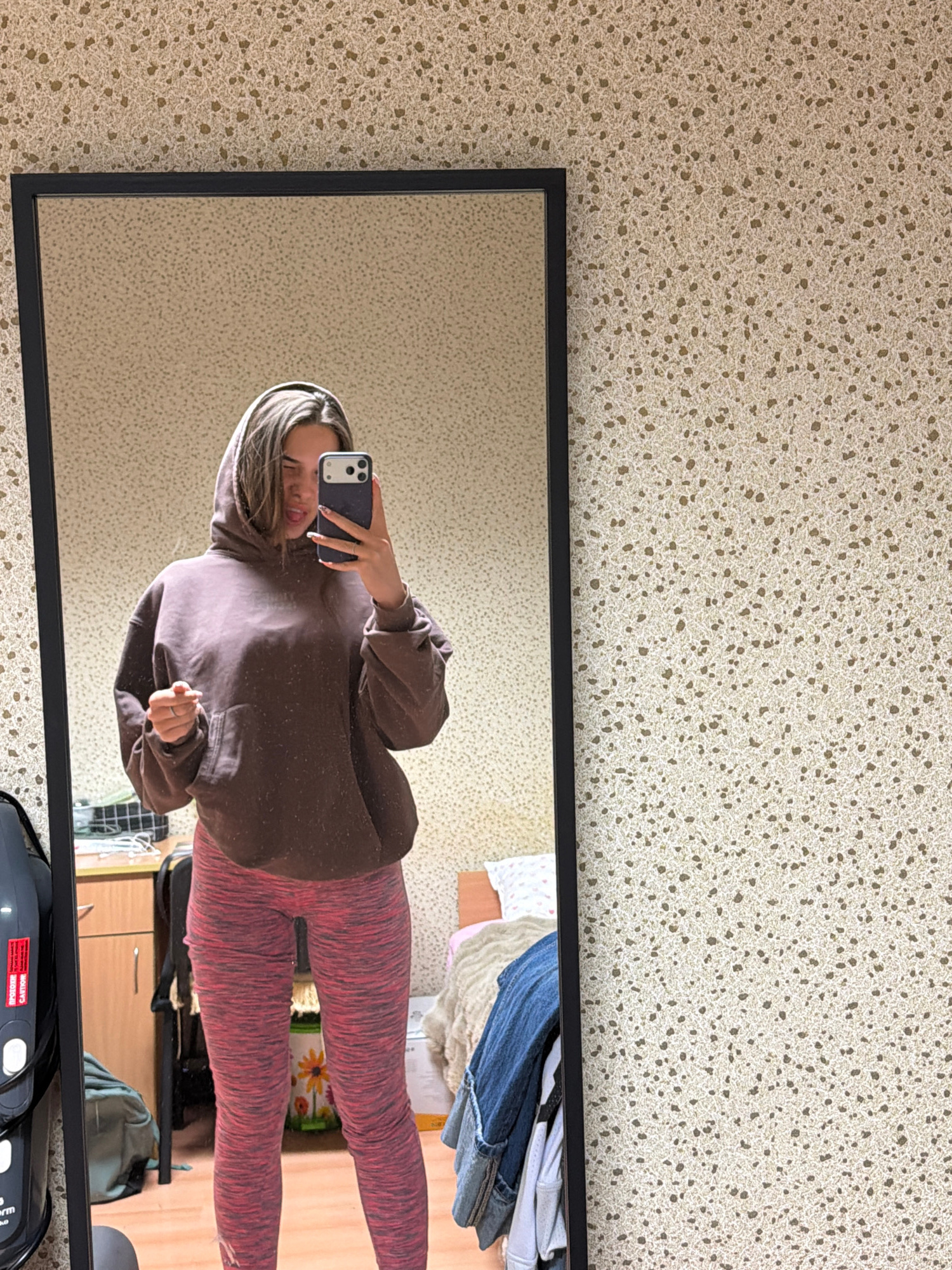 A young woman is captured in a mirror selfie indoors, appearing to be in Sofia, Bulgaria. She stands facing the mirror, holding a dark-colored smartphone, likely an iPhone with dual cameras, to take t…read more