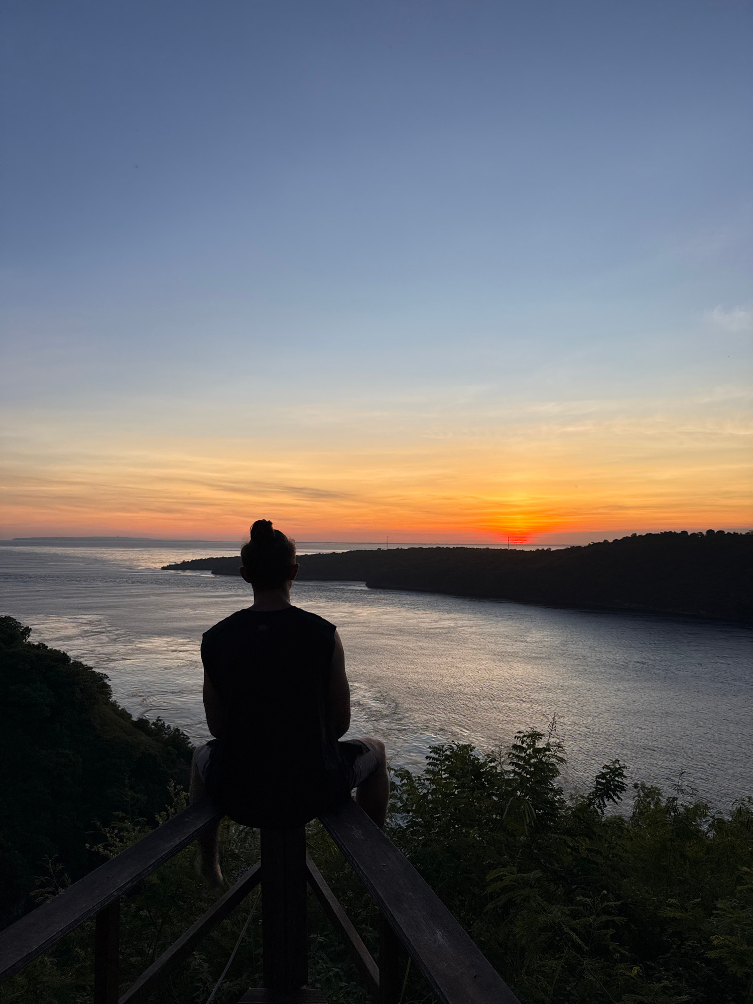 A photograph shows a person looking out over water at sunset. The person is silhouetted against the vibrant colors of the setting sun. The body of water stretches out to meet the horizon, reflecting t…read more