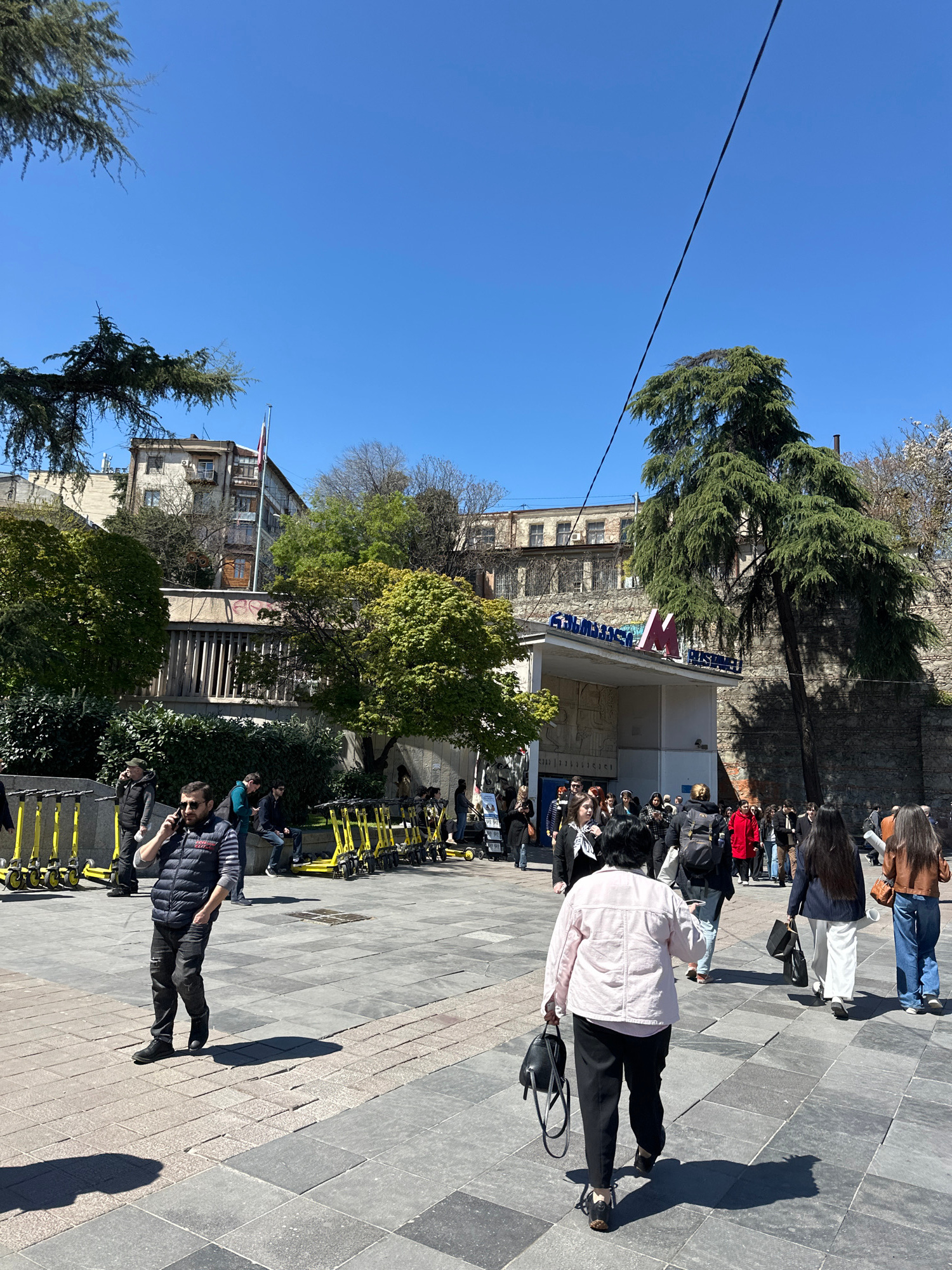 The image shows a sunny day in Tbilisi, Georgia. A crowd of people waits in line outside of a metro station, indicated by a large "M" sign above the entrance. A power line stretches across the clear b…read more