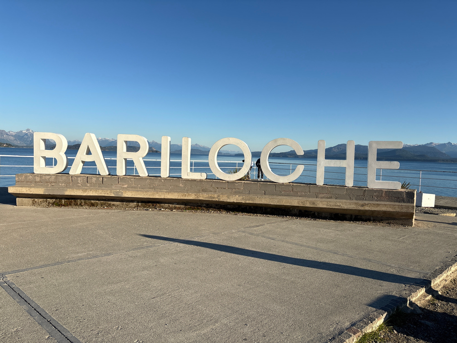 The image displays a panoramic view of a large, white, three-dimensional sign spelling "BARILOCHE" in capital letters, situated on a concrete promenade alongside a large body of water. This location i…read more