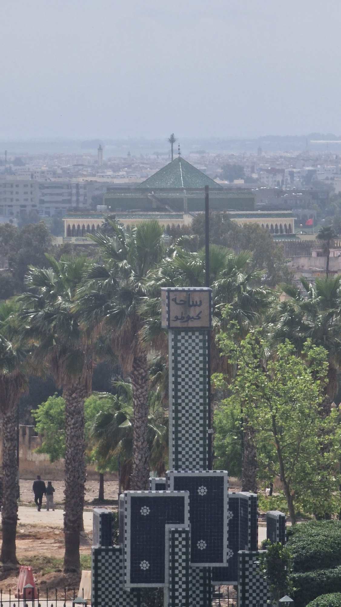 A vertically-oriented shot taken from a high vantage point in Fez, Morocco. It shows a cityscape hazy in the background, featuring a green-tiled roof building with an antenna-like spire. In the foregr…read more