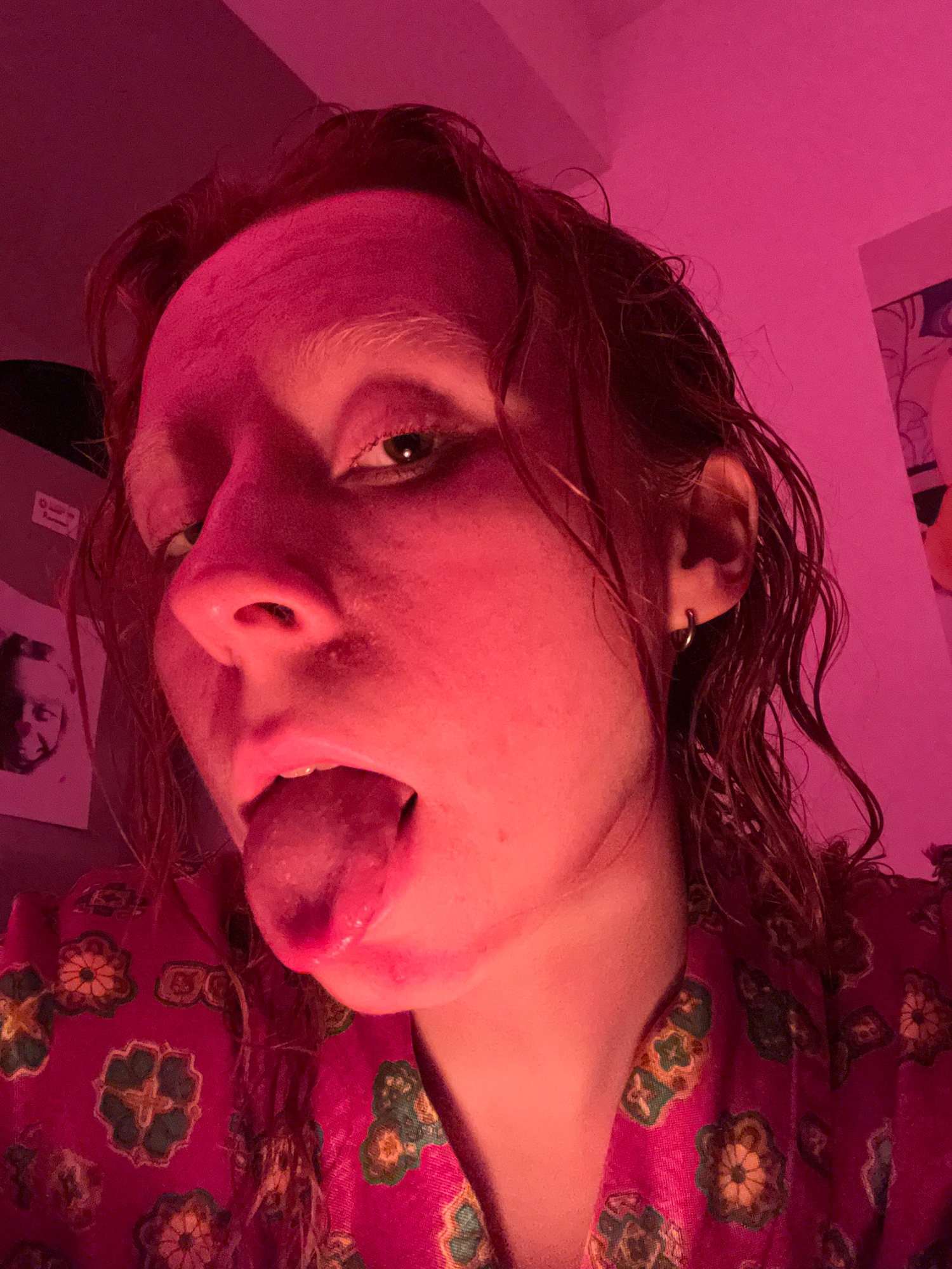 A fair-skinned person with reddish-brown hair is lying on their side, sticking their tongue out. They have an earring in their left ear. They are wearing a pink and green patterned shirt. The lighting…read more