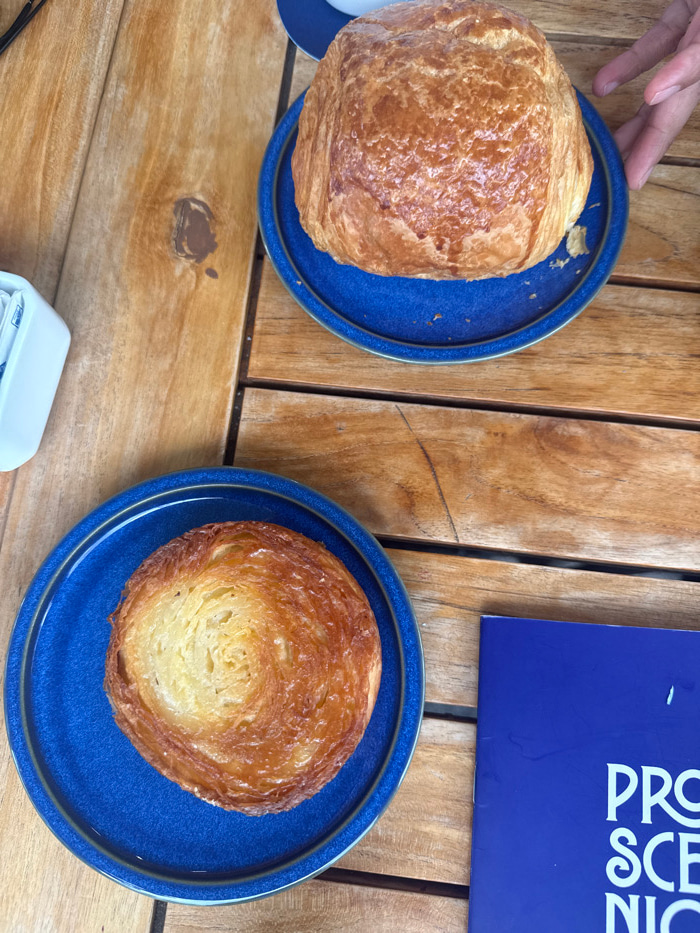An overhead, high-angle shot depicts a tabletop scene in a cafe or restaurant in Mexico City, Mexico. The table surface consists of light brown wooden slats. Two distinct pastries are presented on cir…read more