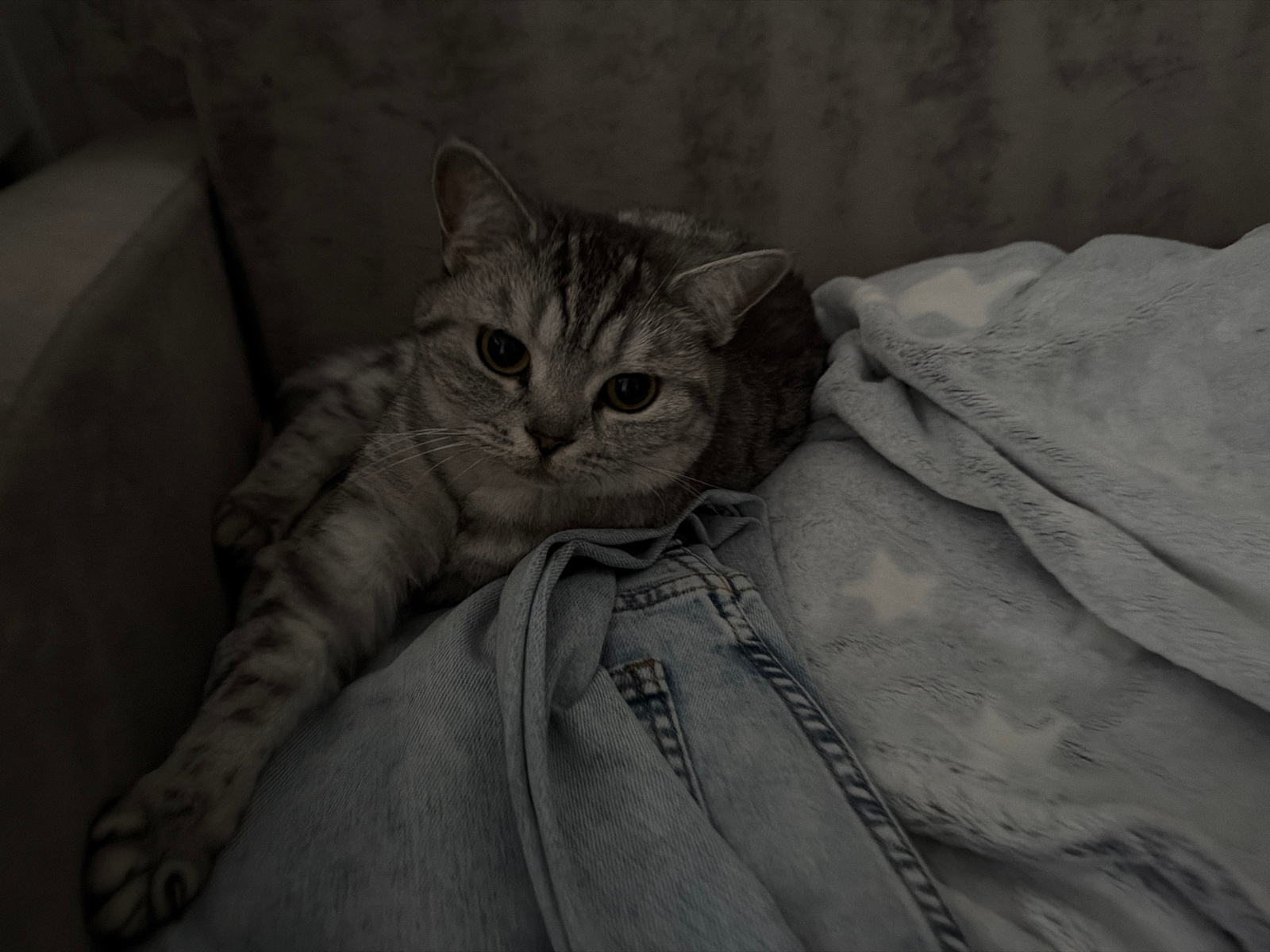 A gray tabby cat is lying on a light gray, textured blanket, partially covered by a folded light blue denim jacket. The setting appears to be indoors on a gray couch. The lighting is dim, suggesting t…read more