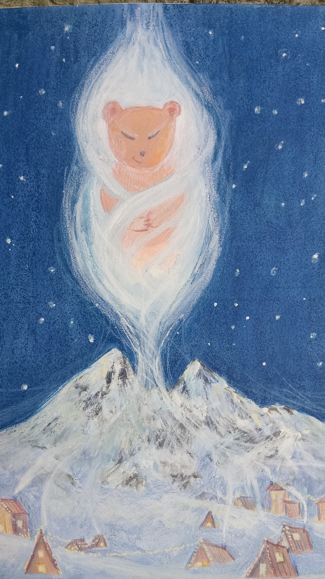 The image depicts a sleeping teddy bear wrapped in white fabric against a dark blue background with white dots, resembling stars. A snow-covered mountain and stylized buildings are on the right. The i…read more