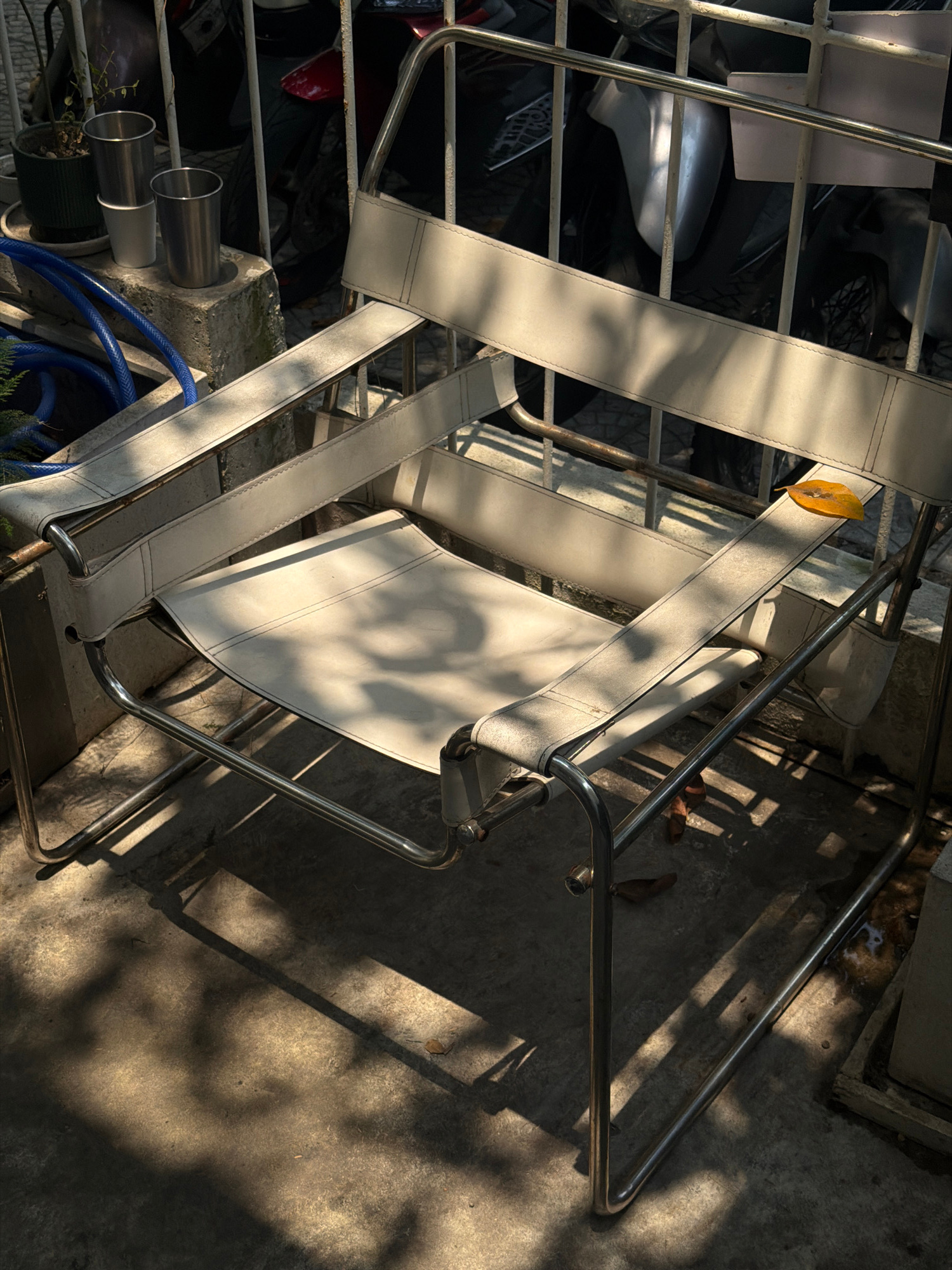 An outdoor scene in Đà Nẵng, Vietnam, features a metal-framed chair with canvas strapping placed next to a railing. The chair and the surrounding concrete ground are cast in strong sunlight and shadow…read more