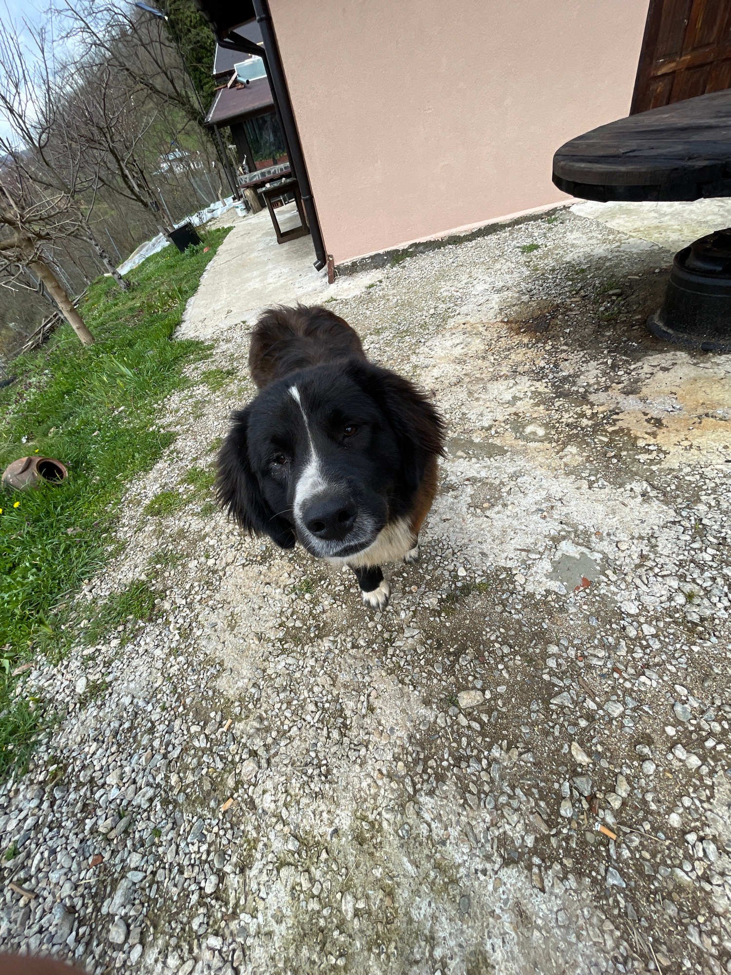 The image shows a medium-sized black and white dog with a white stripe on its face, looking up at the camera. The dog stands on a surface composed of gravel and small patches of green grass. In the ba…read more