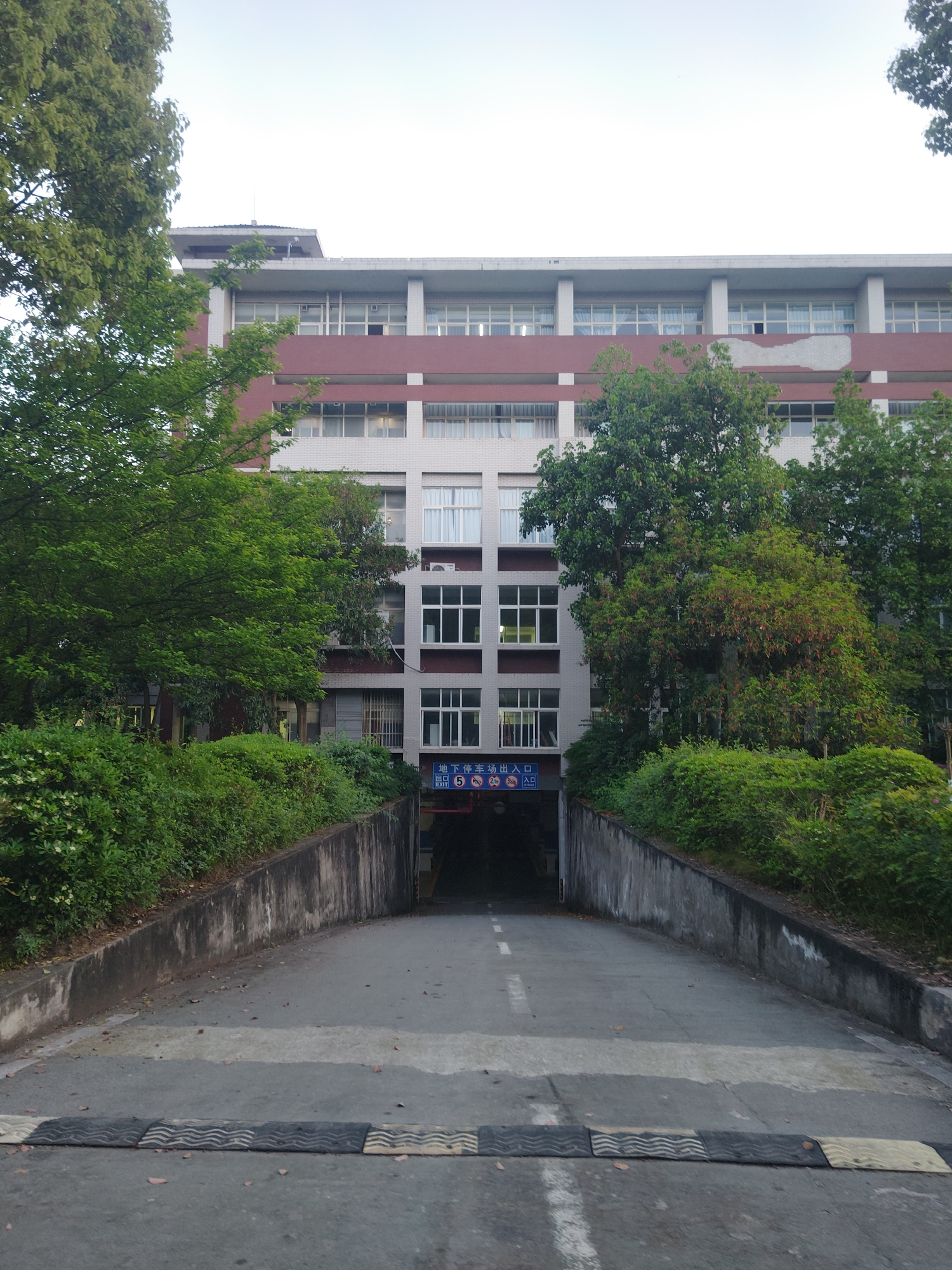 The image shows a building with a multi-story facade, predominantly white and maroon in color, partially obscured by lush green trees and foliage. The building has numerous windows, suggesting it coul…read more