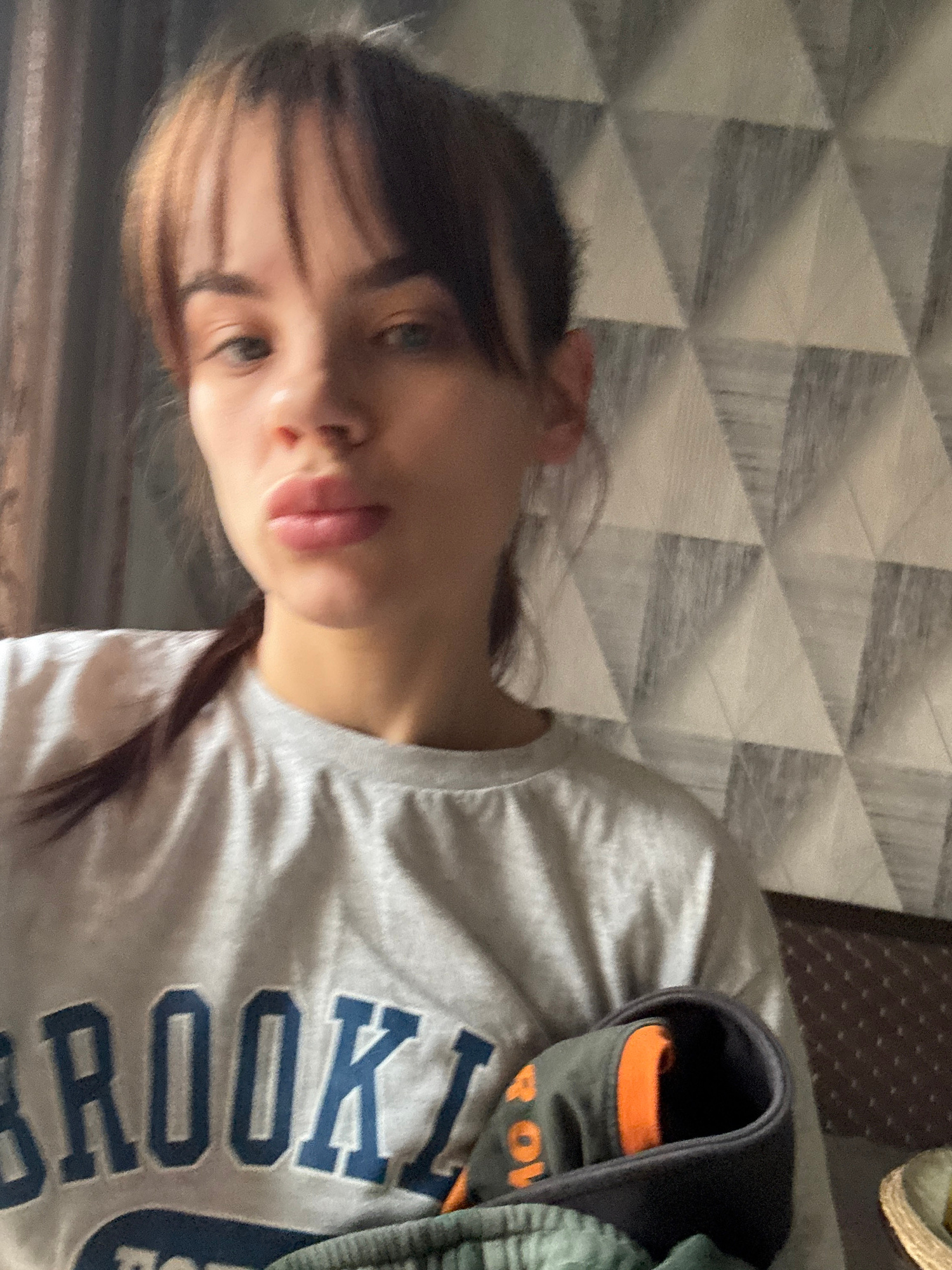 A woman is facing the camera, wearing a gray t-shirt with "BROOKLYN" printed on it in blue. The background is a geometric patterned wall. The location is not specified.