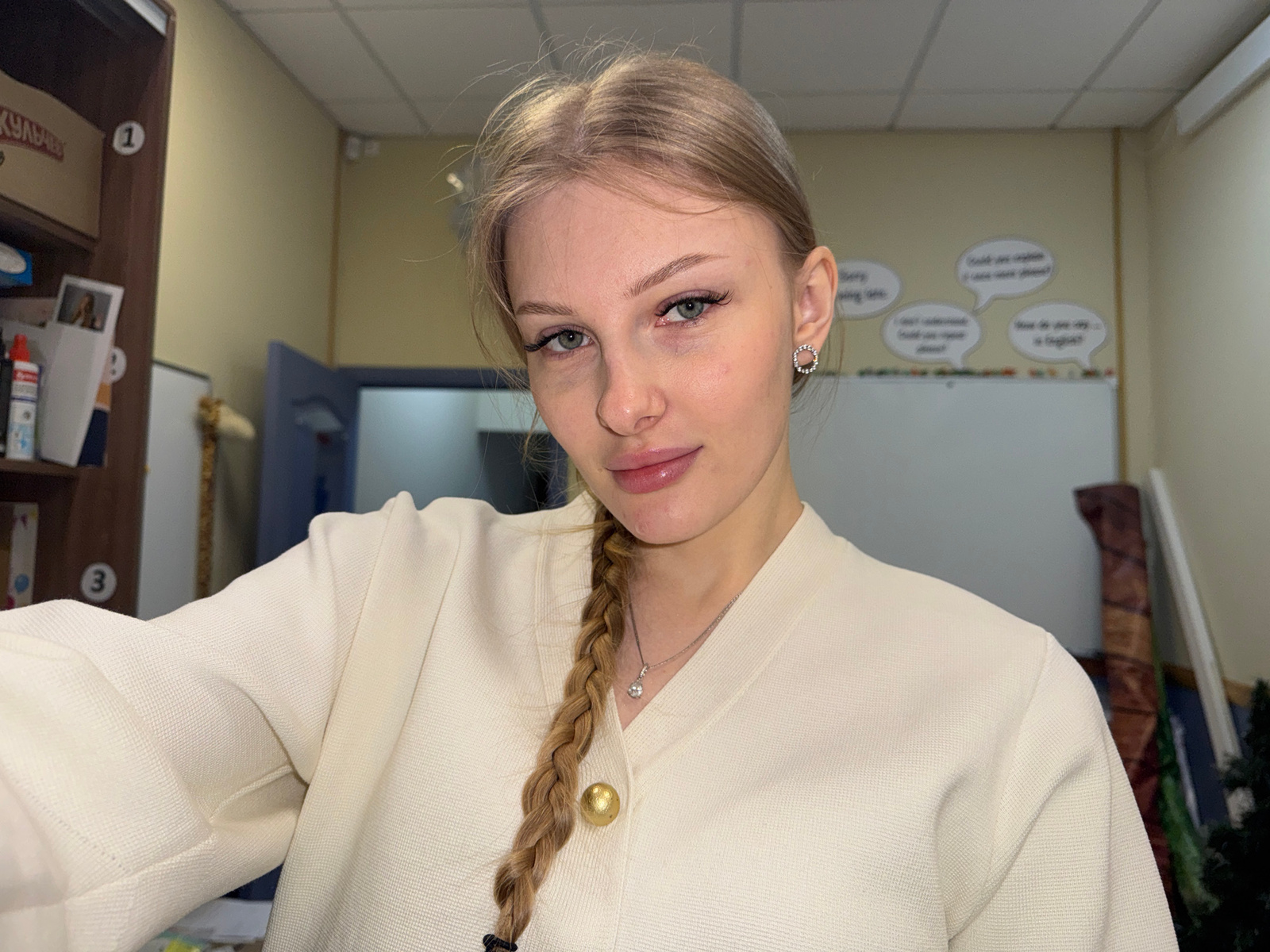 The image is a rotated selfie of a young woman with light blonde hair braided to the side. She is wearing a cream-colored cardigan with a gold button and a silver necklace. She has light eyes and pink…read more