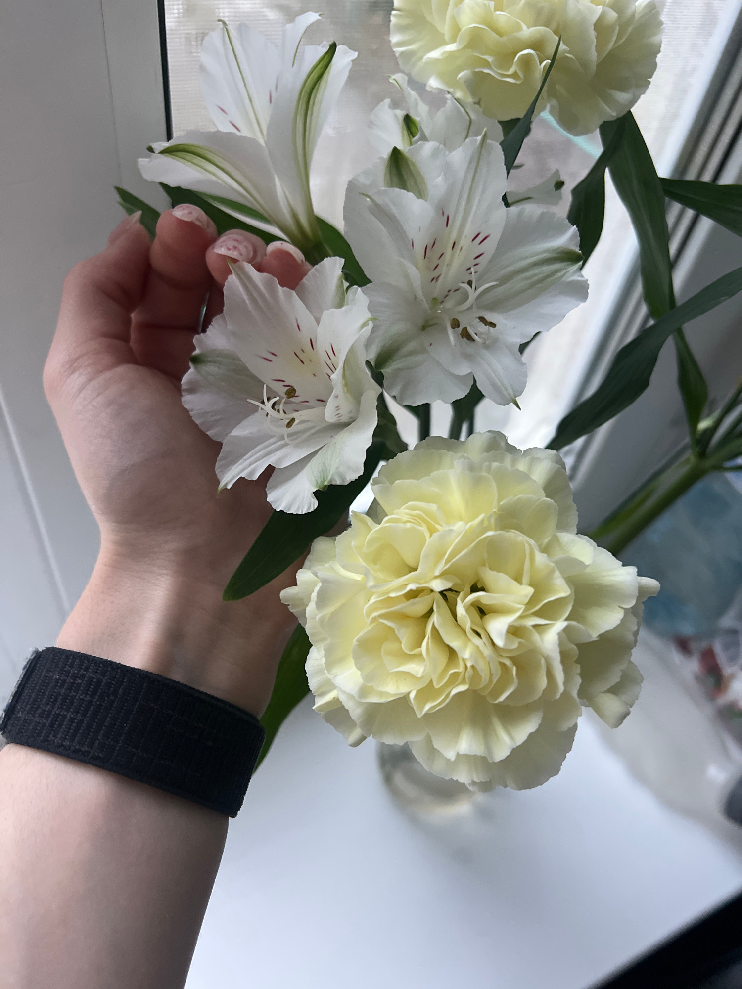 The image displays a close-up of a person's hand holding a bouquet of light-colored flowers indoors, likely in Chaikovsky, Russia. The bouquet consists of several light yellow or cream-colored carnati…read more