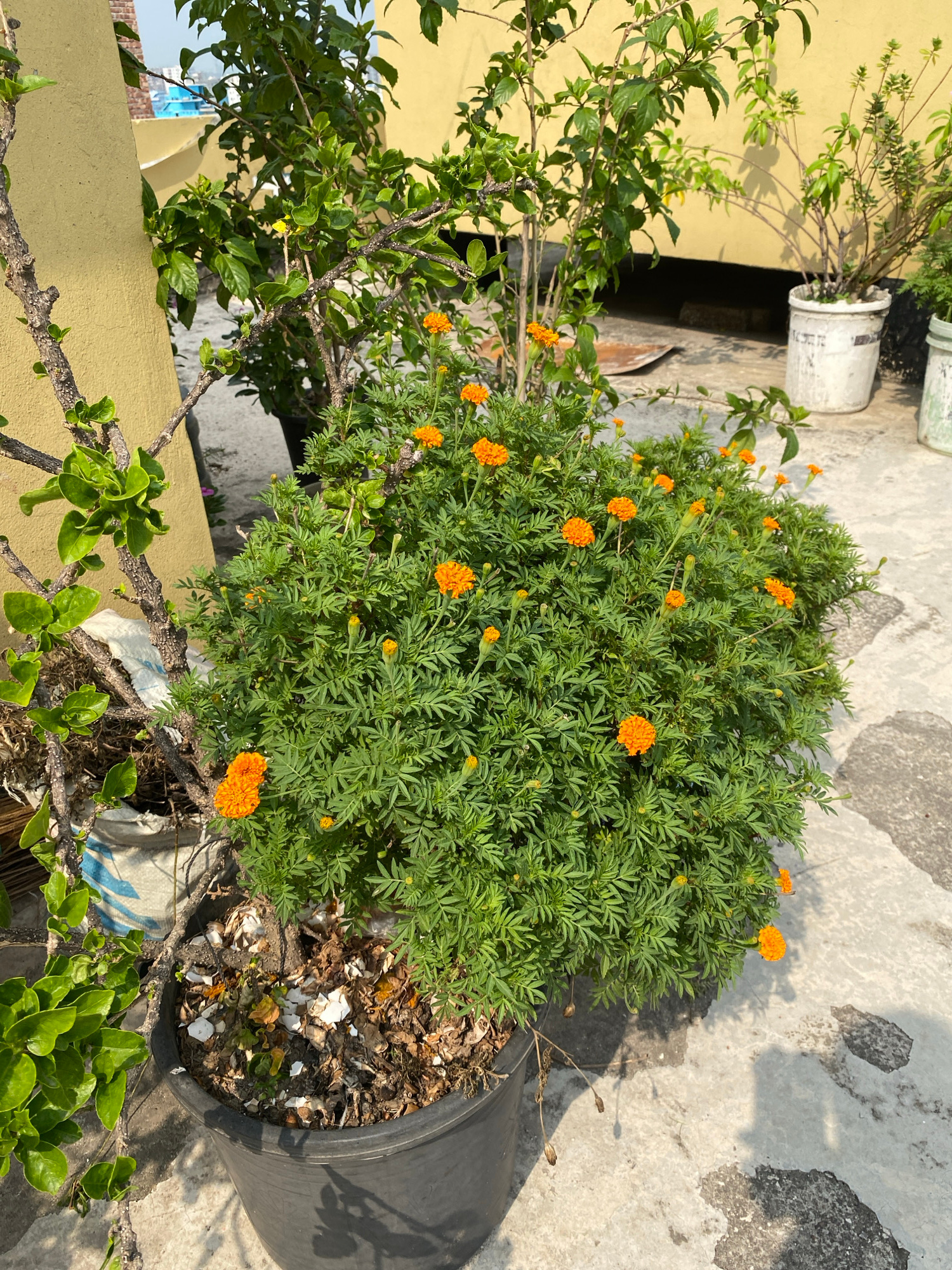 The image shows a rooftop garden scene, likely in Dhaka, Bangladesh, based on architectural styles and plant types common to the region. The main subject is a potted marigold plant, densely filled wit…read more