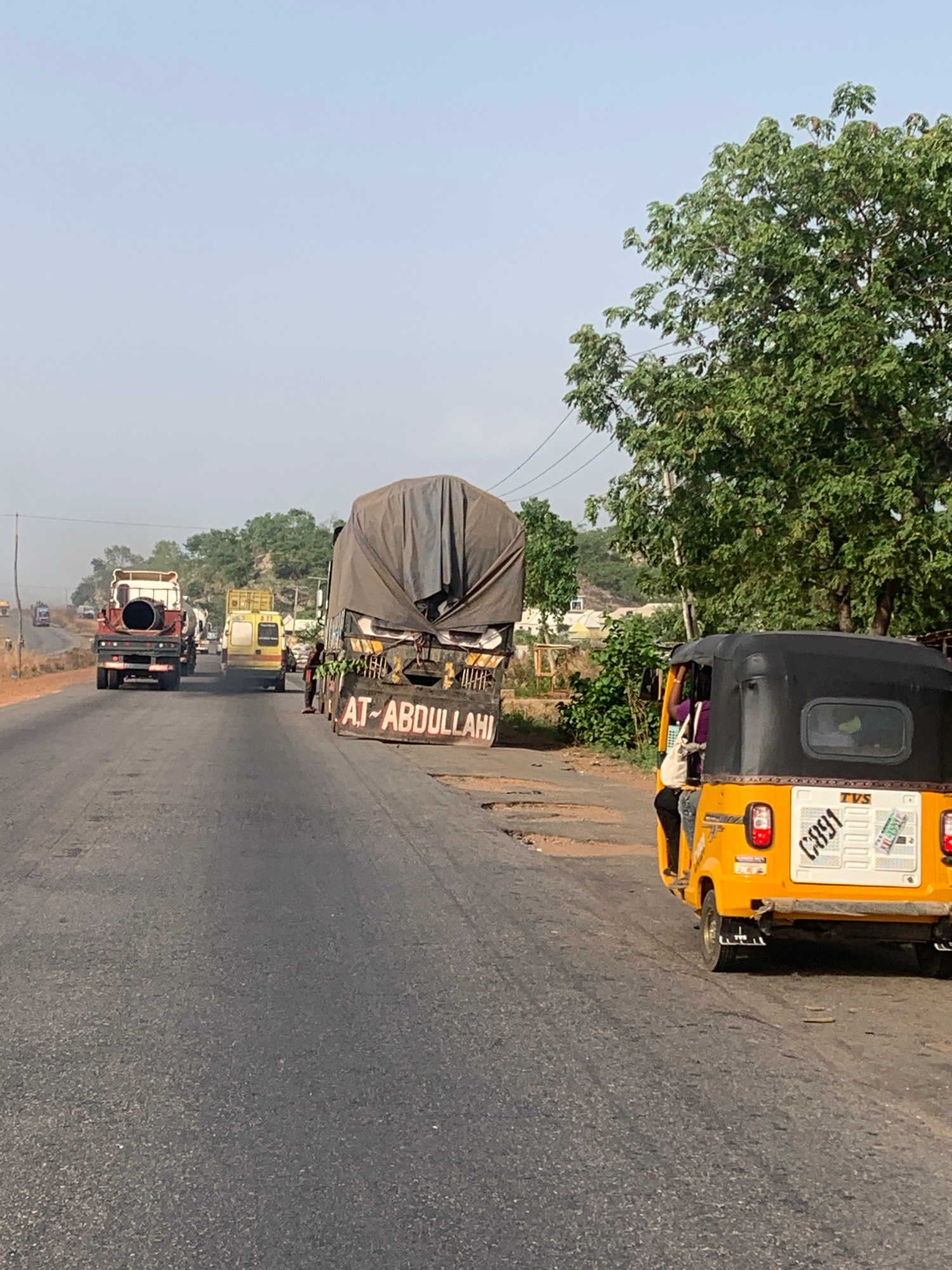 The scene is on a road in Lokoja, Nigeria. A yellow, three-wheeled vehicle is parked on the shoulder of the road. A large truck with "AT-ABDULLAHI" written on the back is partially visible behind it.…read more
