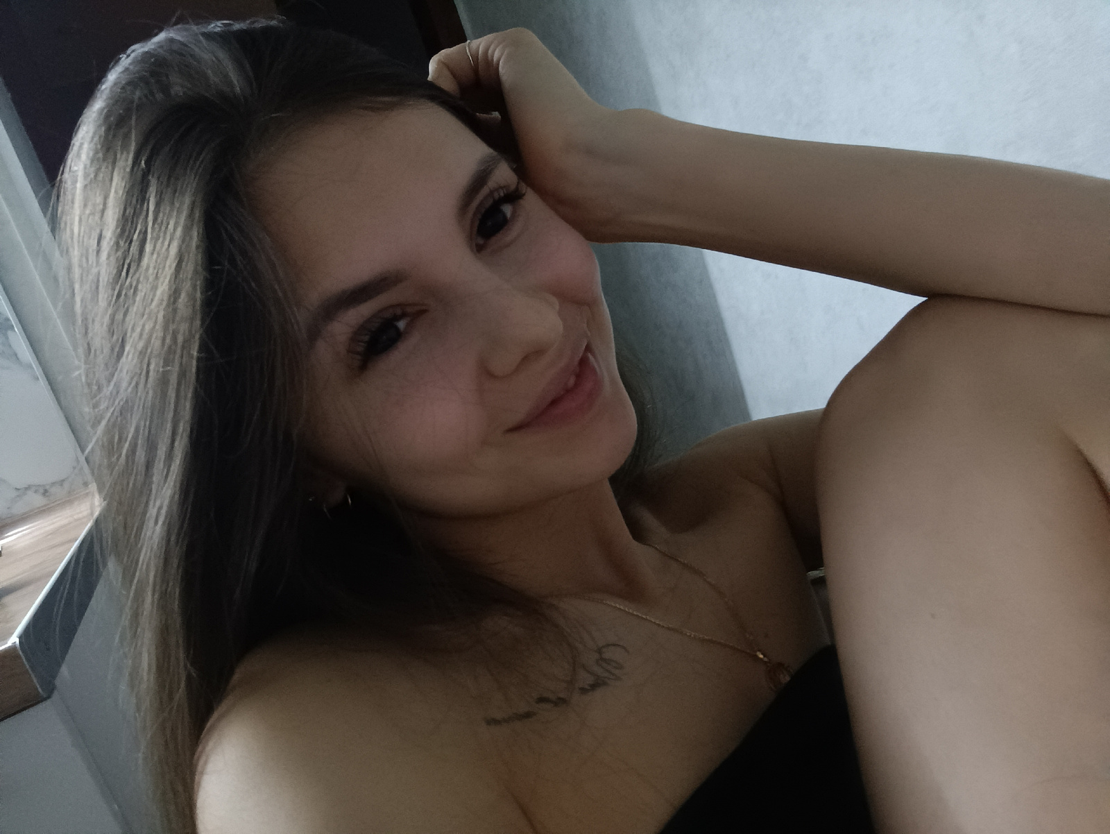 A young woman poses for a selfie. Her dark hair is parted to the side, and she is smiling at the camera. She is wearing a dark strapless top and a delicate gold necklace. Her right hand is raised to h…read more