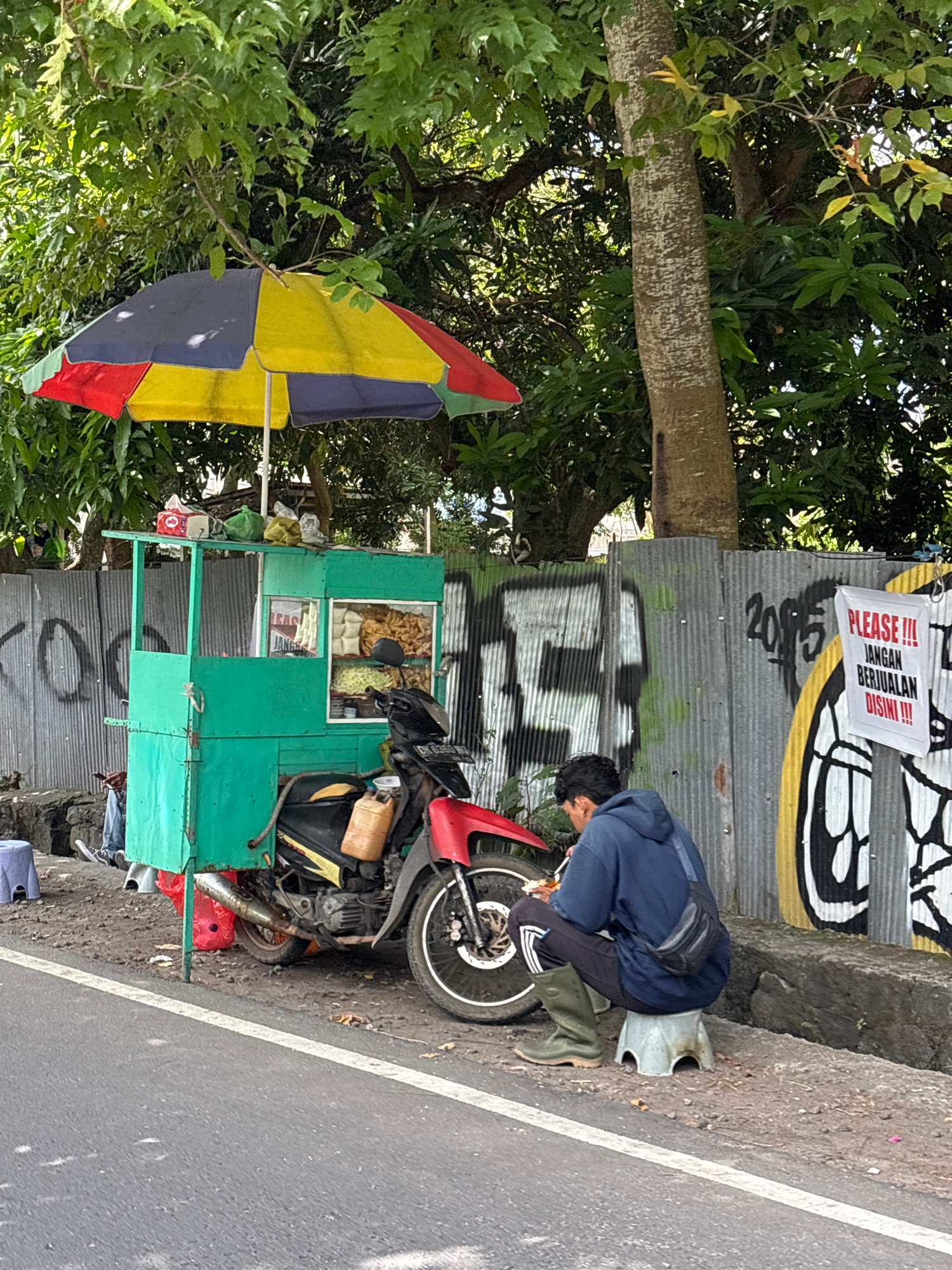 A street scene in North Kuta, Indonesia, features a vendor attending to his mobile food cart. The cart, primarily green with a colorful umbrella attached, is positioned next to a corrugated metal fenc…read more