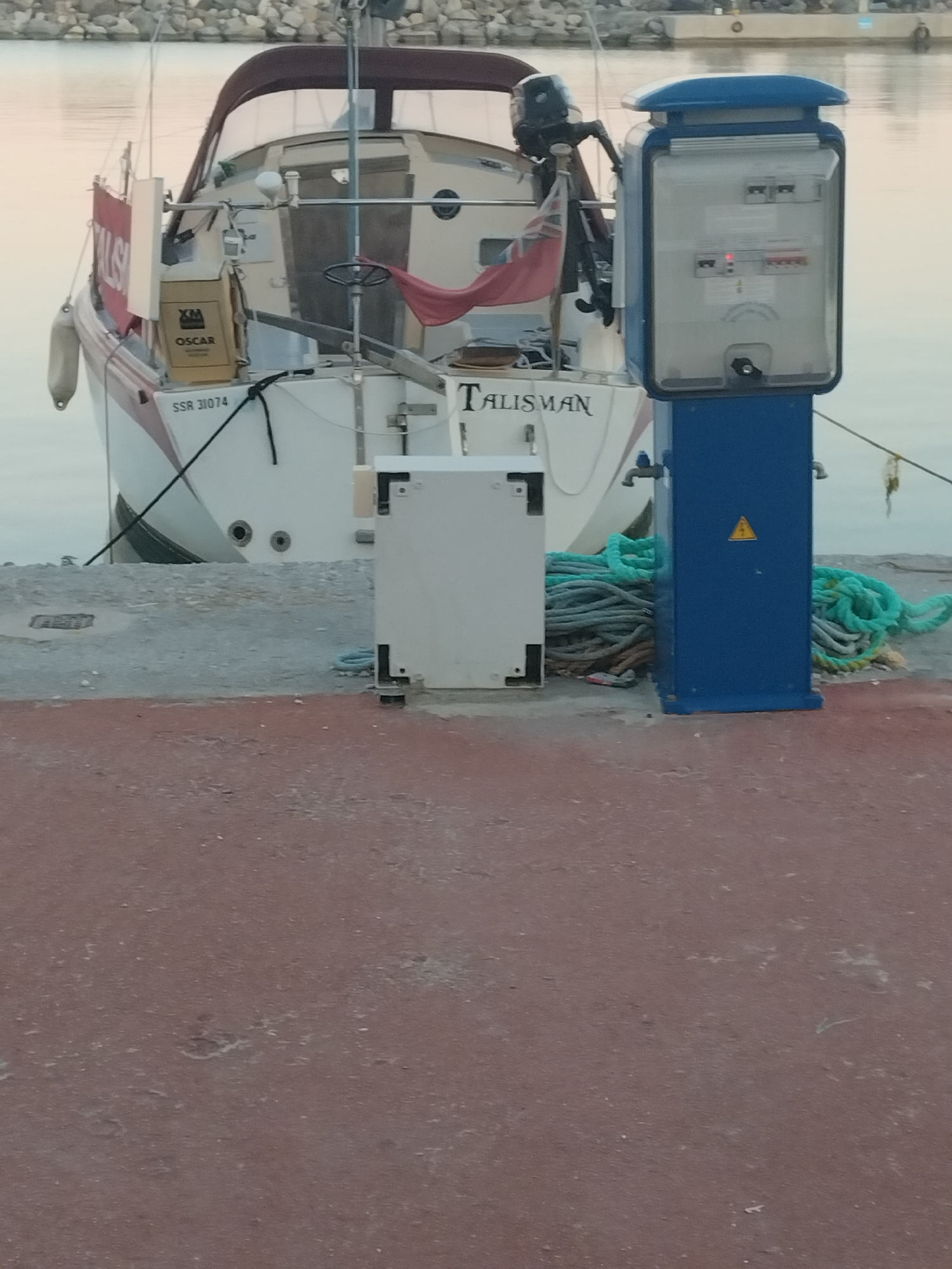 The image shows a boat named "TALISMAN" docked at a marina in Καρδάμαινα, Greece. The boat is white with a maroon canopy. A blue electrical box is adjacent to the boat on the pier. Ropes are also visi…read more