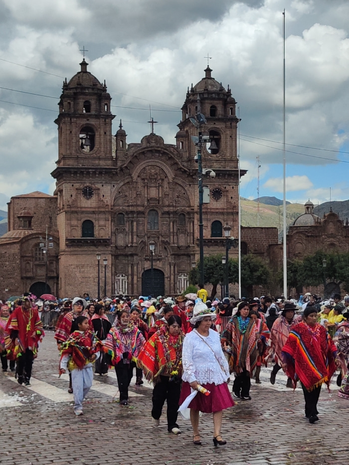 A procession of people dressed in traditional clothing walks in front of a large stone church with two bell towers. The people are wearing colorful ponchos, hats, and dresses. The church is ornately d…read more
