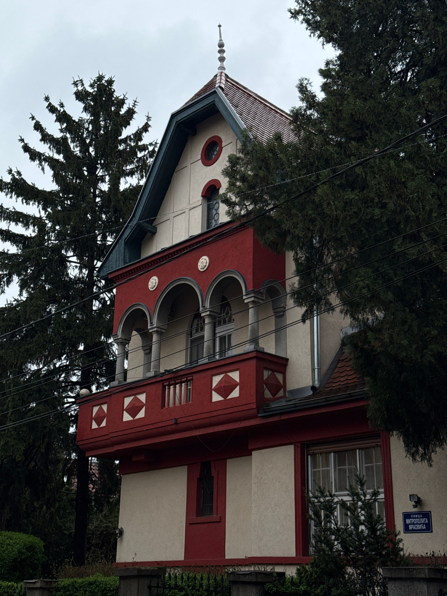 The image depicts a building with distinctive architectural features, including a red and white facade, arched openings supported by columns, and a decorative roof with a spire. The building is partia…read more