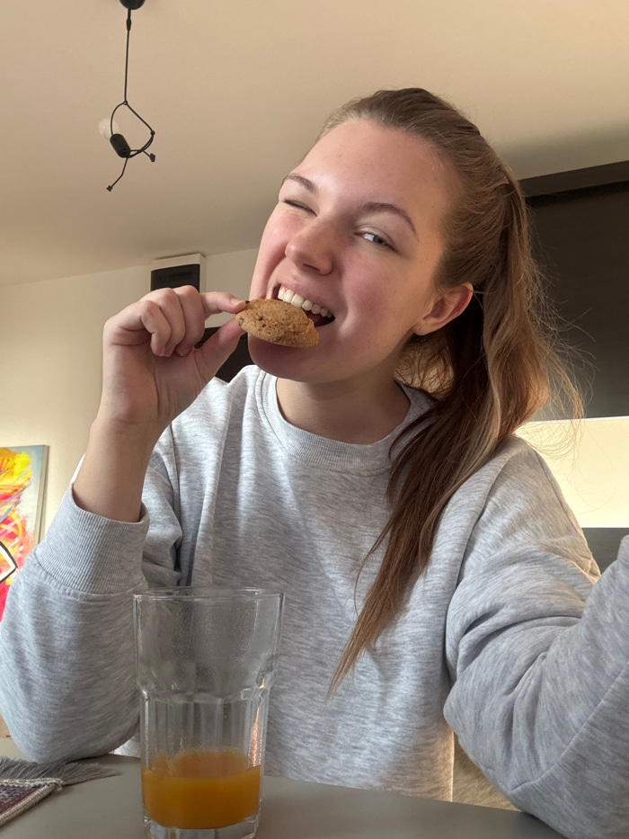 A young adult female is depicted indoors, in the city of Vozdovac Urban Municipality, Serbia. She is seen from the chest up, positioned centrally, with her head slightly angled and her left eye closed…read more