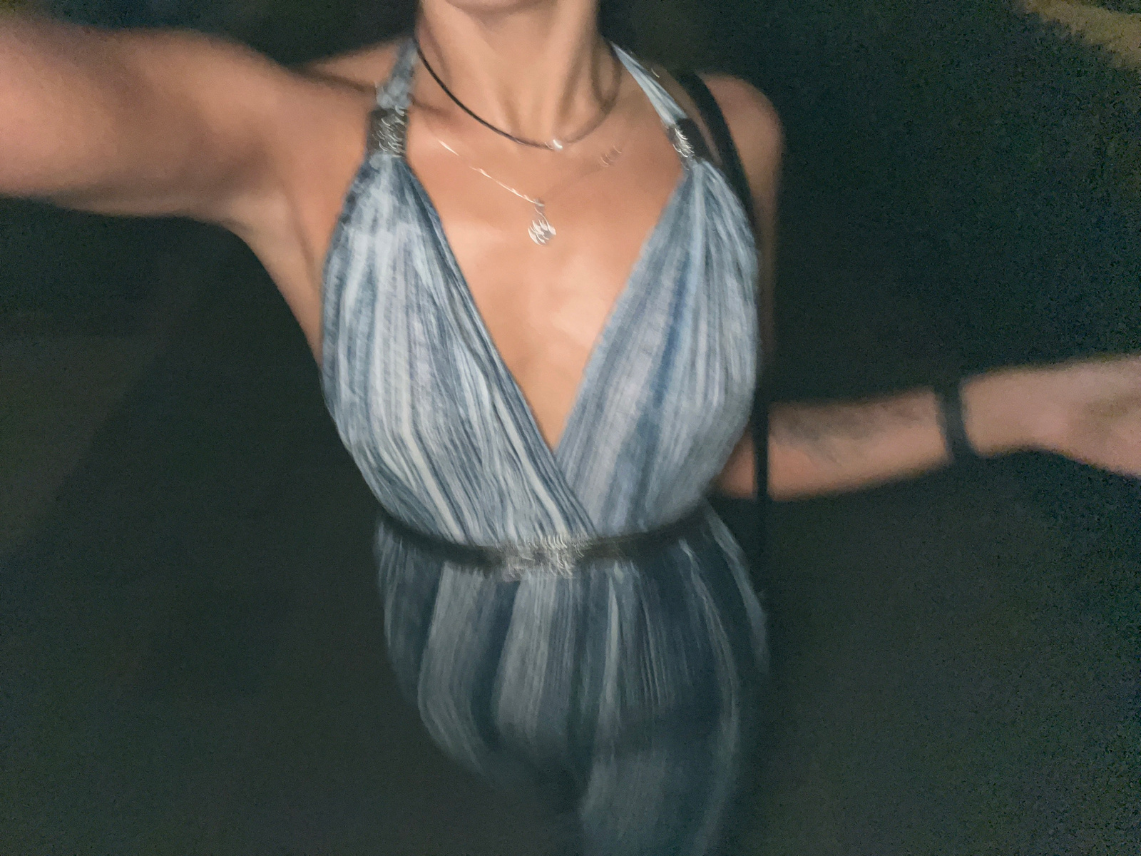 The image shows a person with light skin, wearing a grey and white striped garment that covers their chest and shoulders. The garment is gathered at the top, possibly forming a type of headdress or he…read more