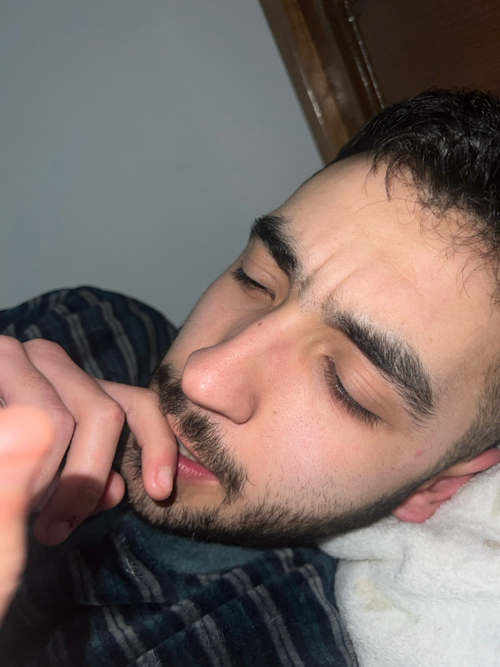 A close-up angled shot shows a man with dark hair, thick eyebrows, and a beard. His eyes are closed, and his brow is furrowed. He is lying on his side, with a white pillow or soft material near his ea…read more
