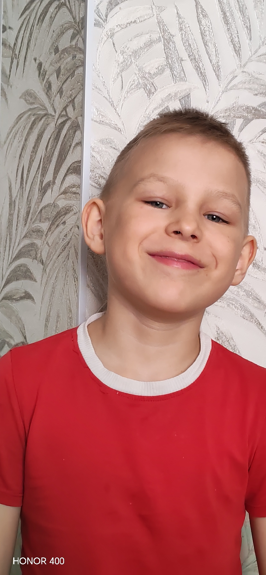 A young boy with short, light-colored hair smiles at the camera. He is wearing a red t-shirt with a white collar. The background consists of a patterned wallpaper with leaf-like designs. The location is in Noviy, Russia, based on the 'HONOR 400' watermark in the lower left of the frame. | Open Wire