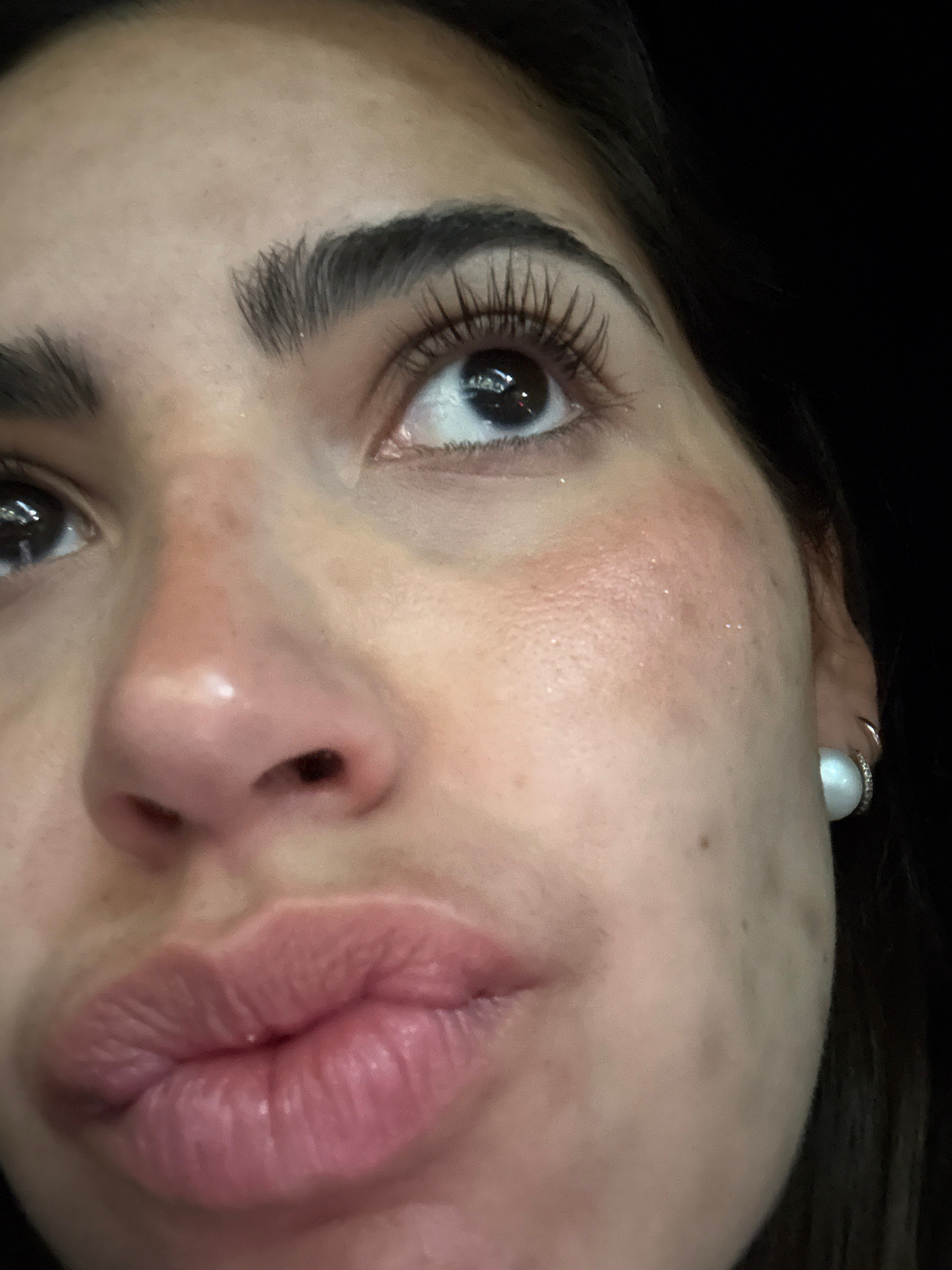 A close-up, upward-angled view of a woman's face. She has dark hair, light skin, and prominent eyelashes. Her lips are full and tinted pink. A ring, featuring a white pearl, is visible above her forehβ¦read more