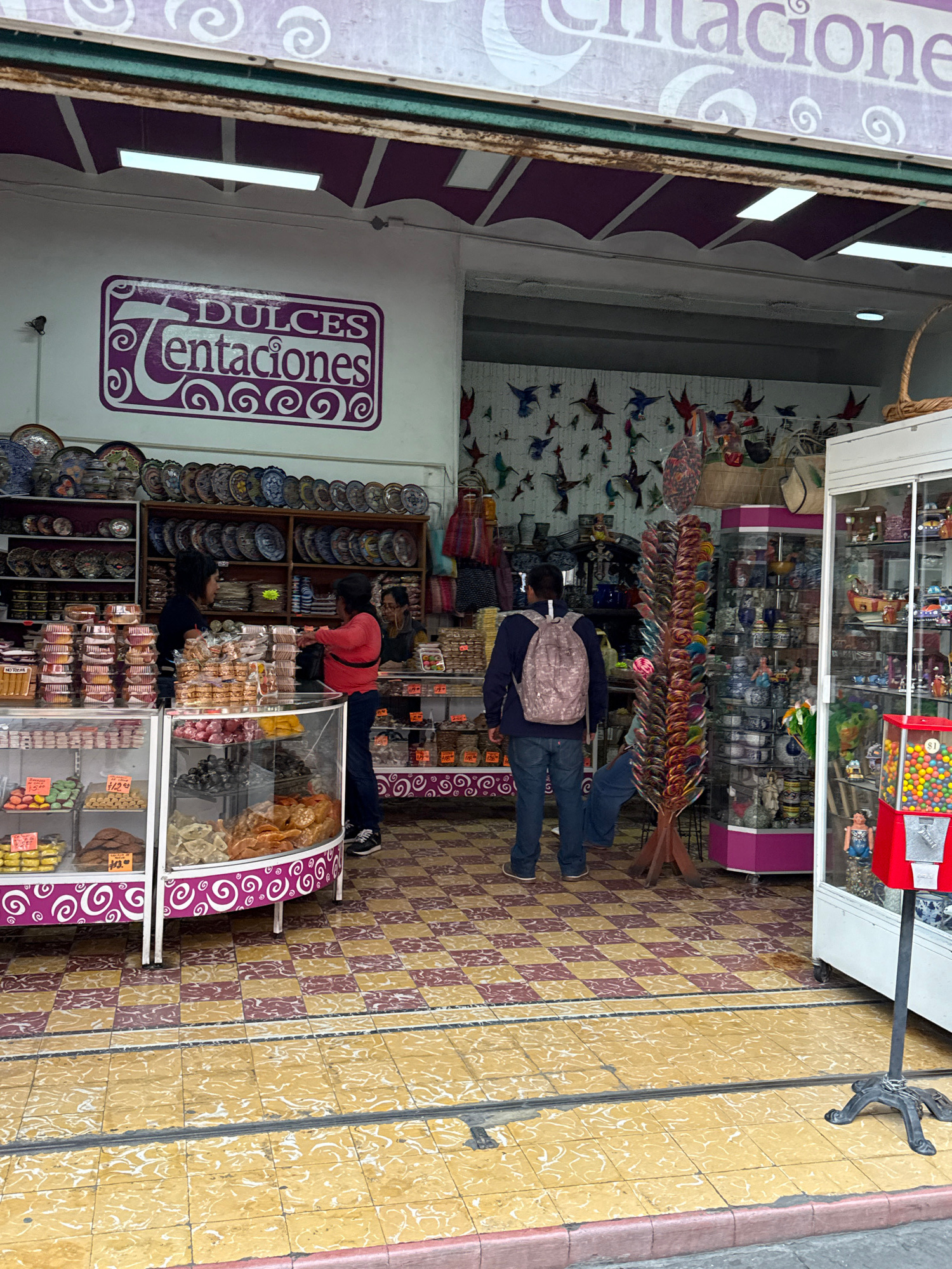 An image captures the entrance and interior of a vibrant shop named "DULCES Tentaciones" (Sweet Temptations) in Puebla, Mexico. The shop specializes in both traditional sweets and local crafts. The i…read more