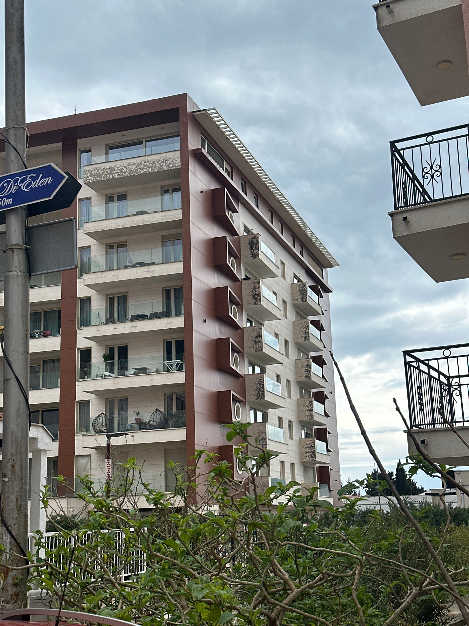 An outdoor image depicts a modern, multi-story residential building under an overcast sky, located in Budva, Montenegro, specifically indicated by a blue directional sign reading "Do Eden" and "50m" m…read more