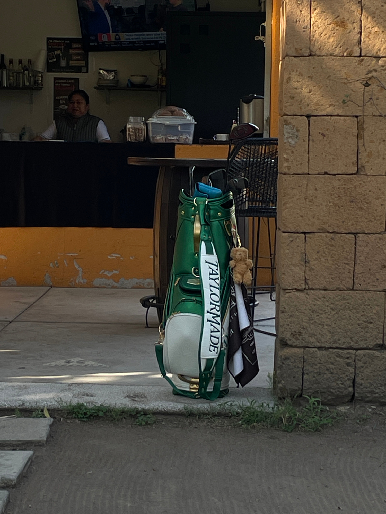 The image shows a green and white TaylorMade golf bag with a teddy bear sitting on top, positioned on a sidewalk or patio adjacent to a building, in Cholula, Mexico. The building is constructed from l…read more