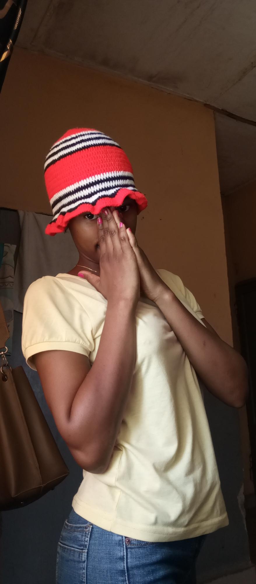 A young woman is captured in a half-body portrait, standing indoors. She is wearing a distinctive crocheted bucket hat with alternating red, white, and black stripes, a pale yellow short-sleeved t-shi…read more