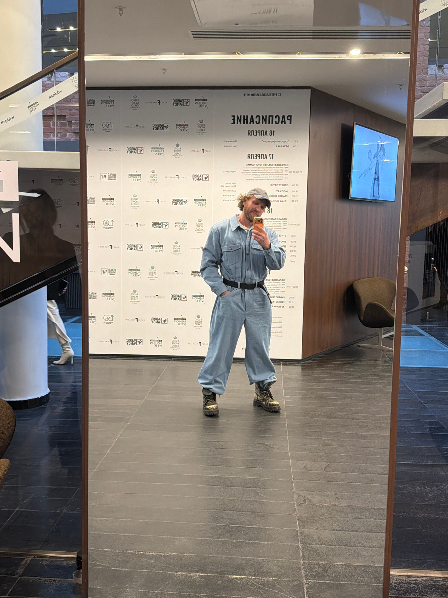 An indoor scene in what appears to be a public building or exhibition space, likely in Saint Petersburg, Russia, given the visible text and context. The primary focus is a full-body reflection of a pe…read more