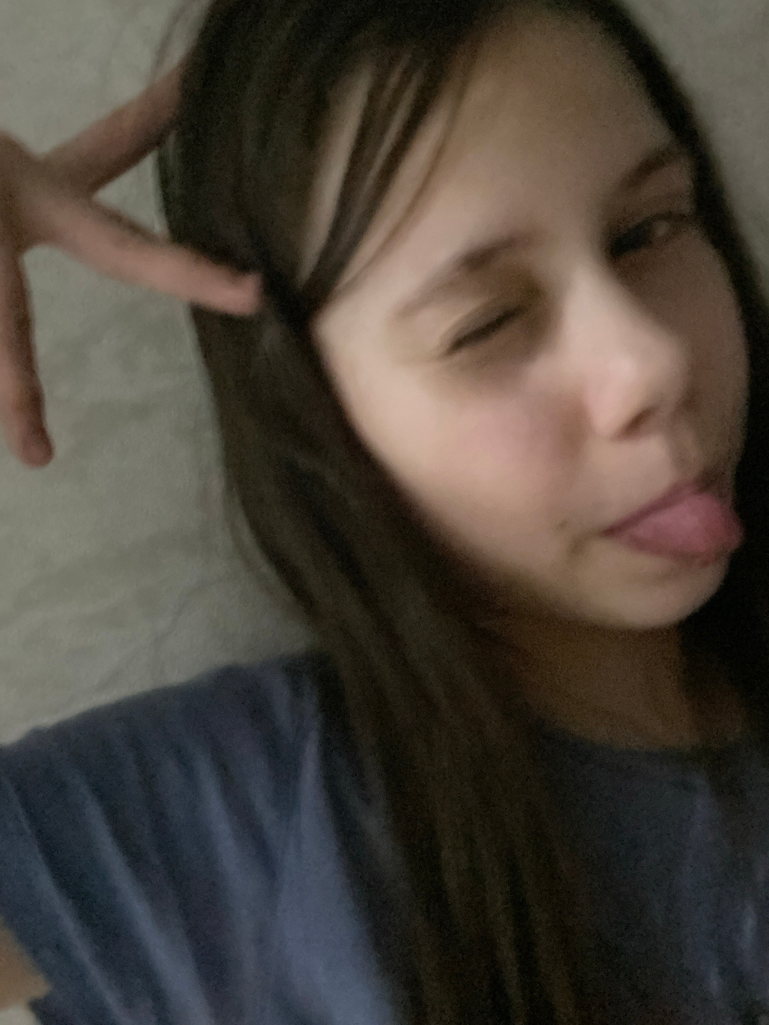 A person with brown hair is lying down, sticking their tongue out, and making a peace sign. The person is lying on what appears to be a bed with a light-colored sheet and is wearing a blue shirt. The…read more