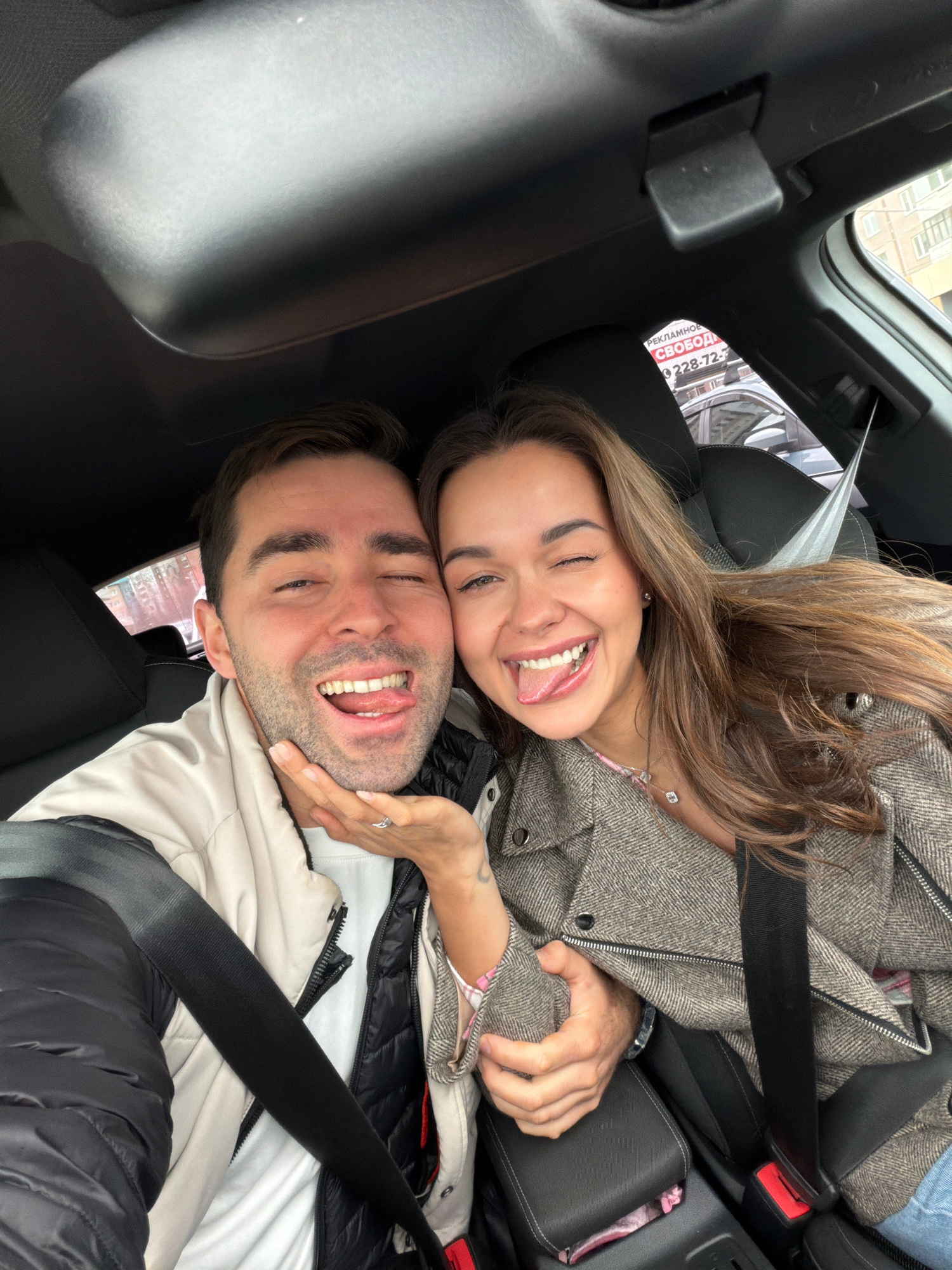 Two people are seated in a car. The individuals, a male and female, are wearing seatbelts. The female is wearing a tweed-like jacket with her hair partially covering her face. The male is wearing a liβ¦read more
