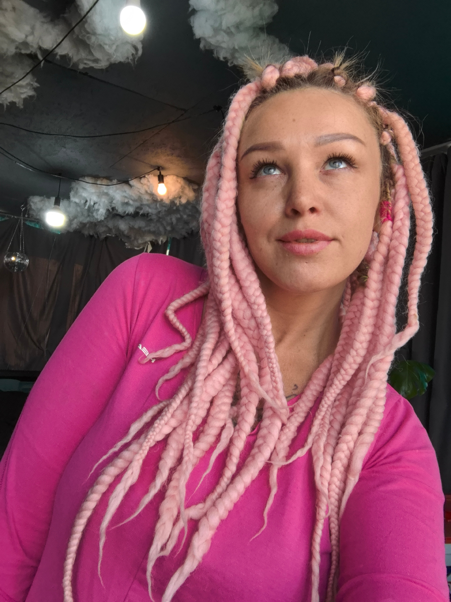 A woman with pink braids looks upward in a room decorated with artificial clouds and hanging lights. The room's ceiling is partially visible, showing a dark surface adorned with the cloud-like decorat…read more