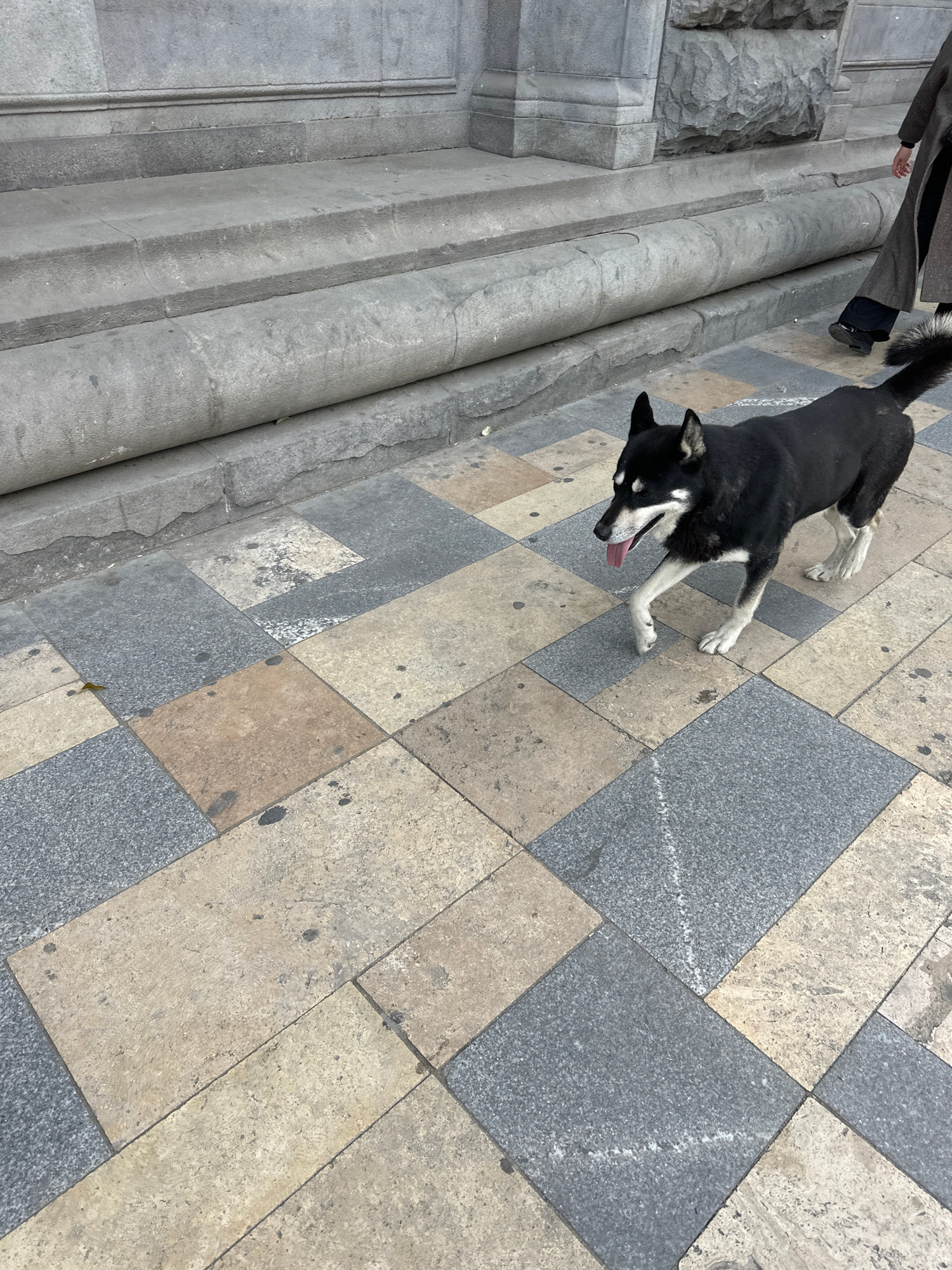 The scene captured in Tbilisi, Georgia, portrays a black and white dog with its tongue out, lying on a paved surface of alternating gray and tan rectangular stones. The dog appears to be panting, pote…read more