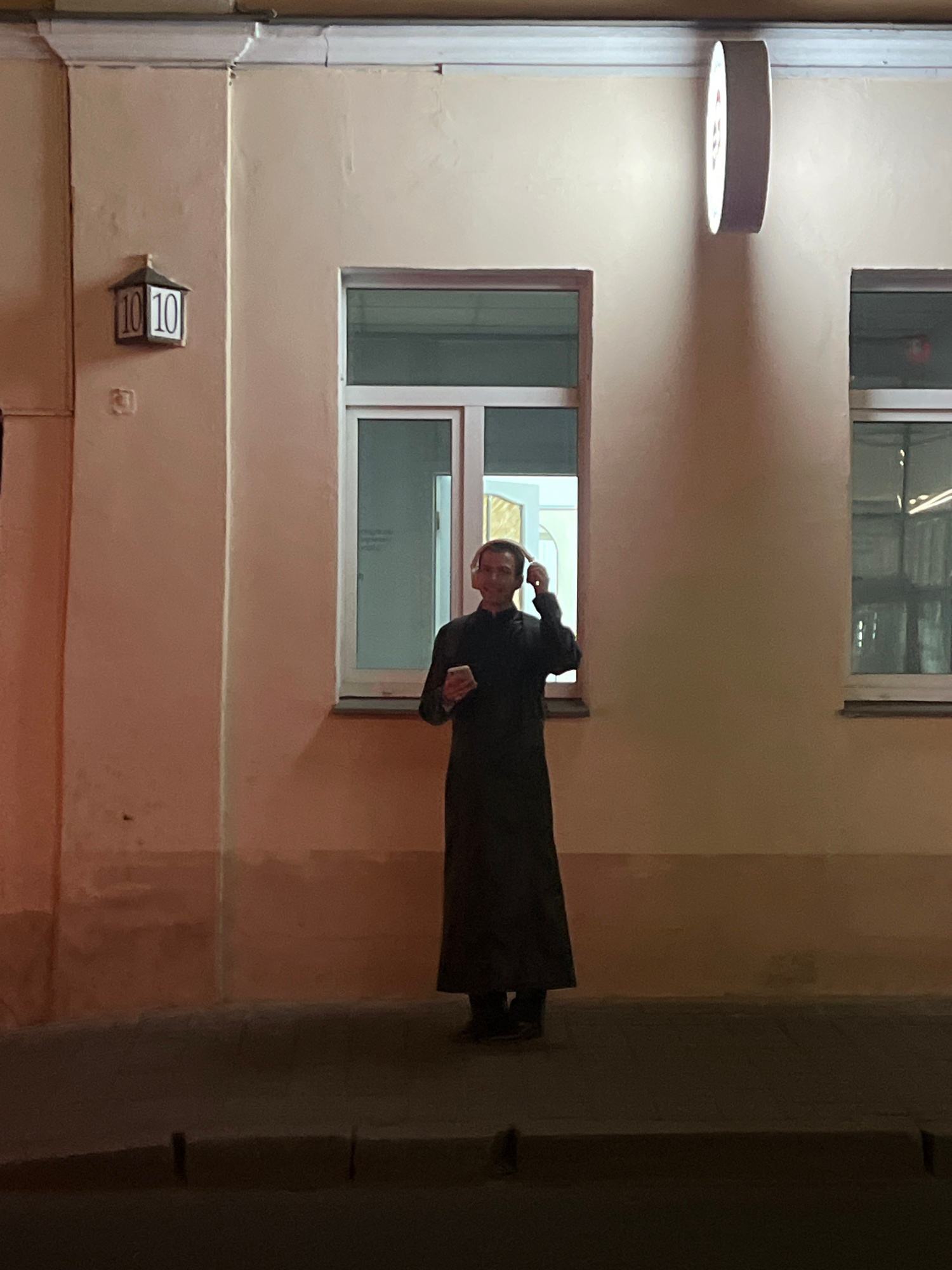 The image shows the exterior of a building, potentially in Minsk, Belarus. A person is standing near a window on the building's facade. The building is light-colored and has multiple windows. A light…read more