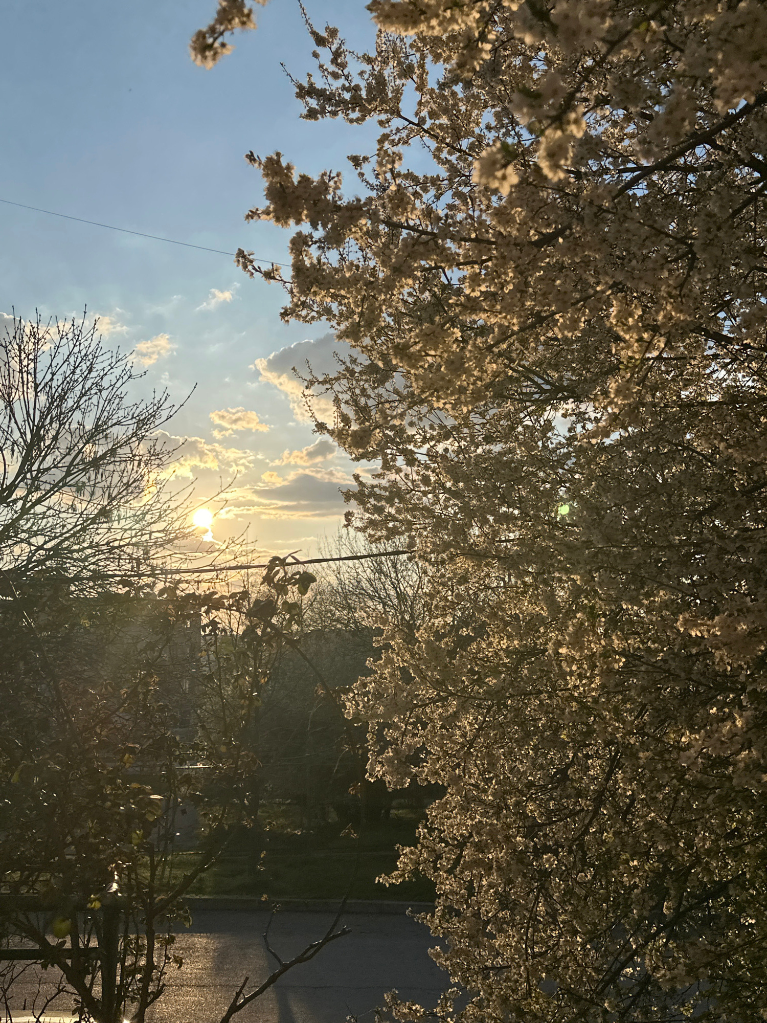 The image shows a view looking upwards through flowering trees towards the setting sun. The location appears to be in an urban environment due to the presence of a paved road on the right side of theβ¦read more