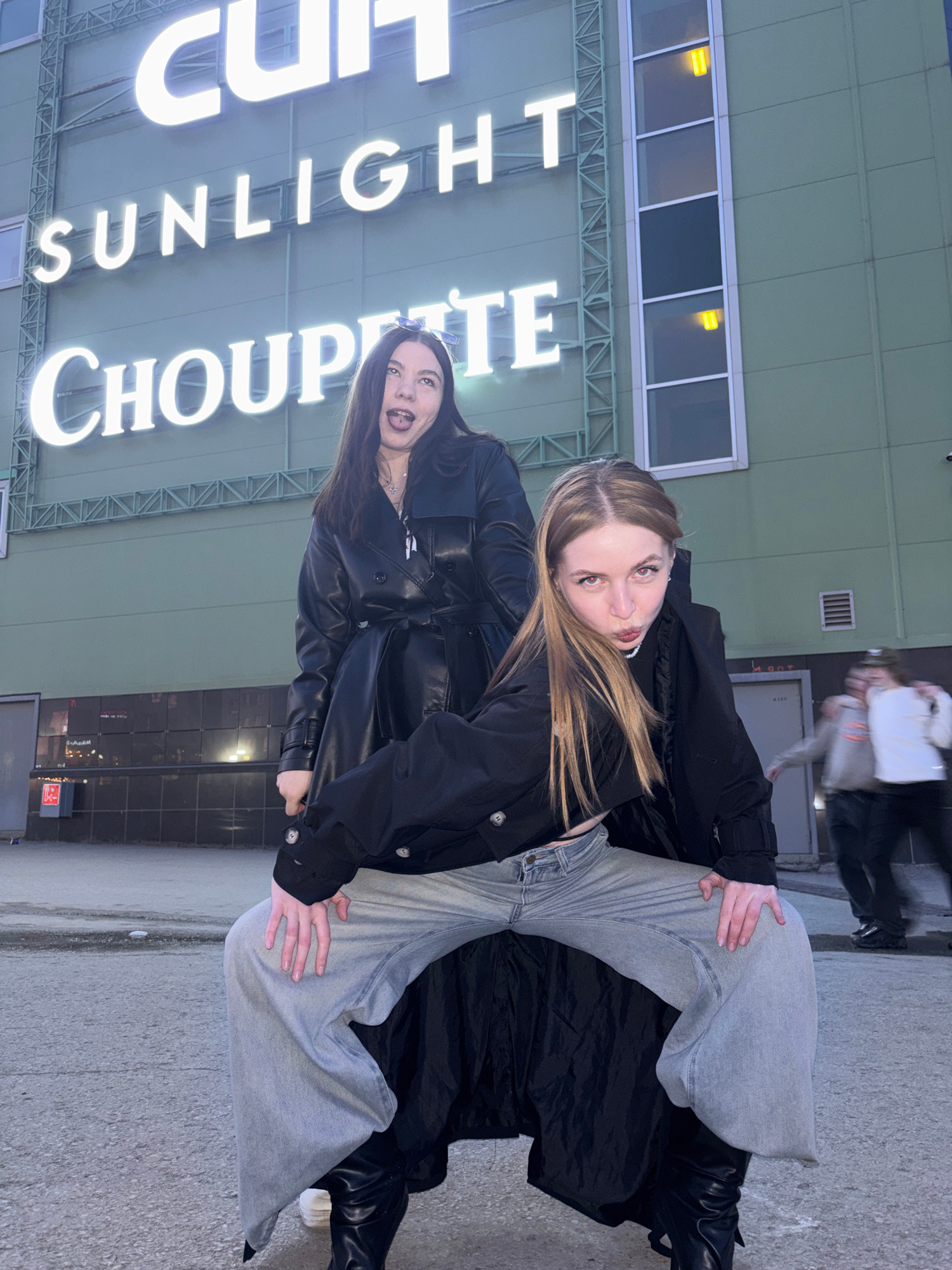 Two women are posing for a picture in Perm, Russia, in front of a building with the words "CULT SUNLIGHT CHOUPETTE" illuminated in white neon letters. One woman is wearing a black jacket and light gra…read more