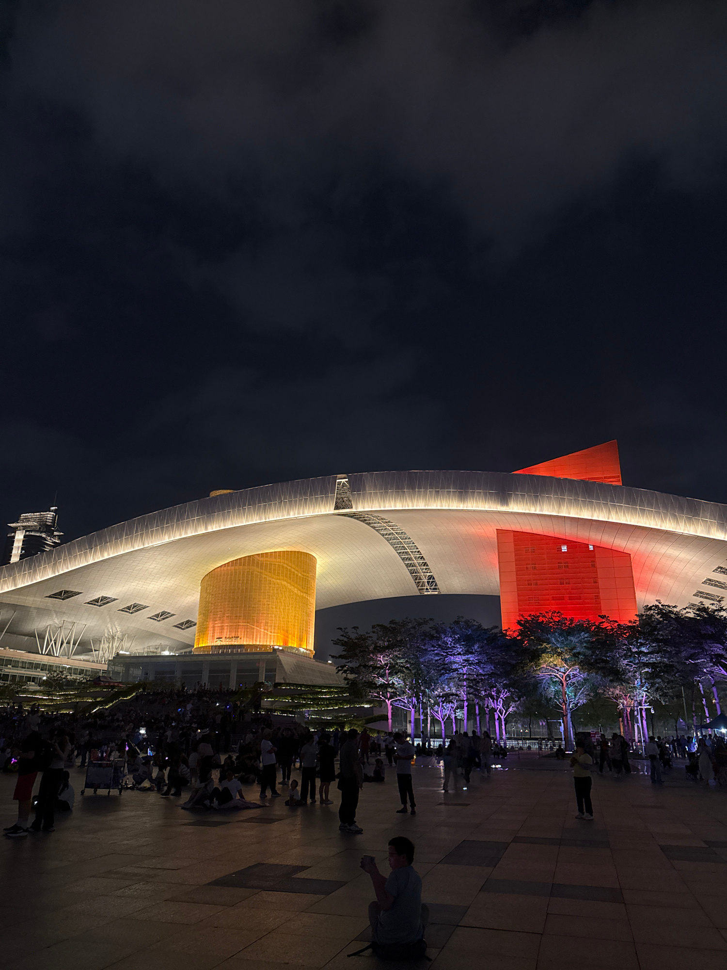 A night-time outdoor view of a crowd gathered at a building in Futian District, China. The curved building has red and gold lit sections. Some people stand on a plaza, others sit, as the scene is lit…read more