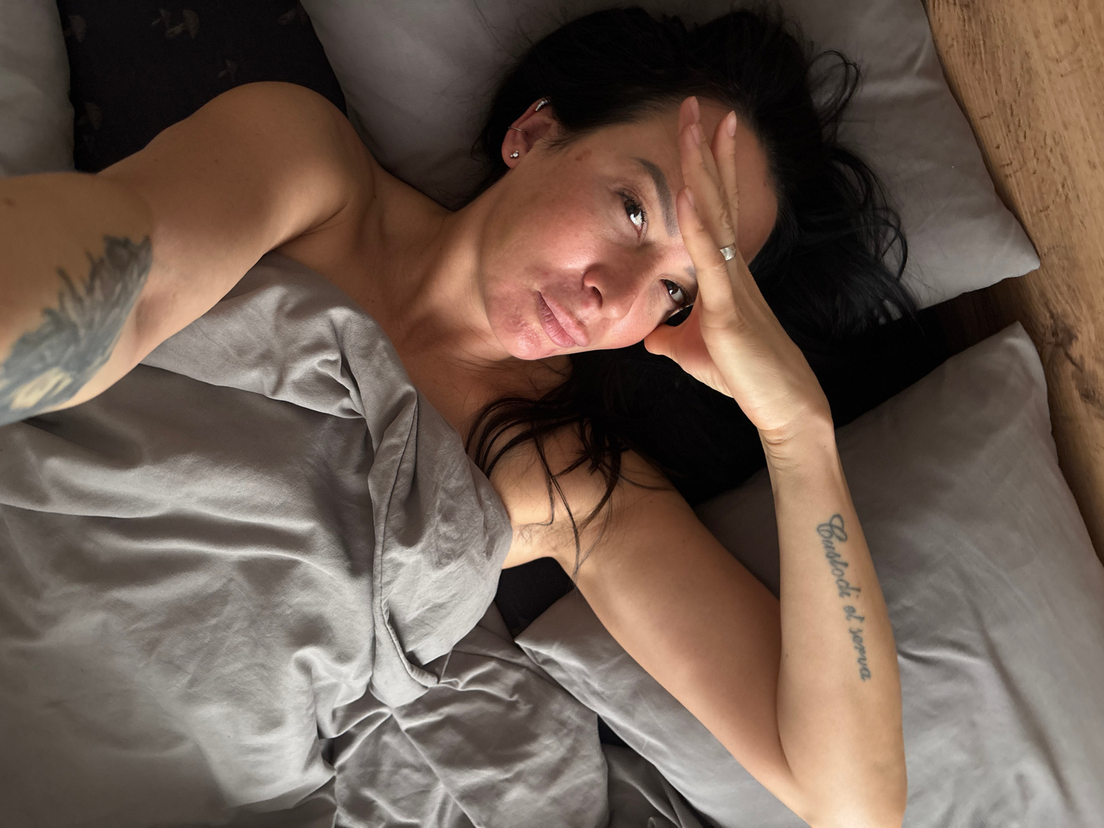 A woman is depicted lying on her back, looking directly at the camera. She has long, dark hair spread across a grey pillow beneath her head. Her expression is neutral, with her right hand resting on h…read more