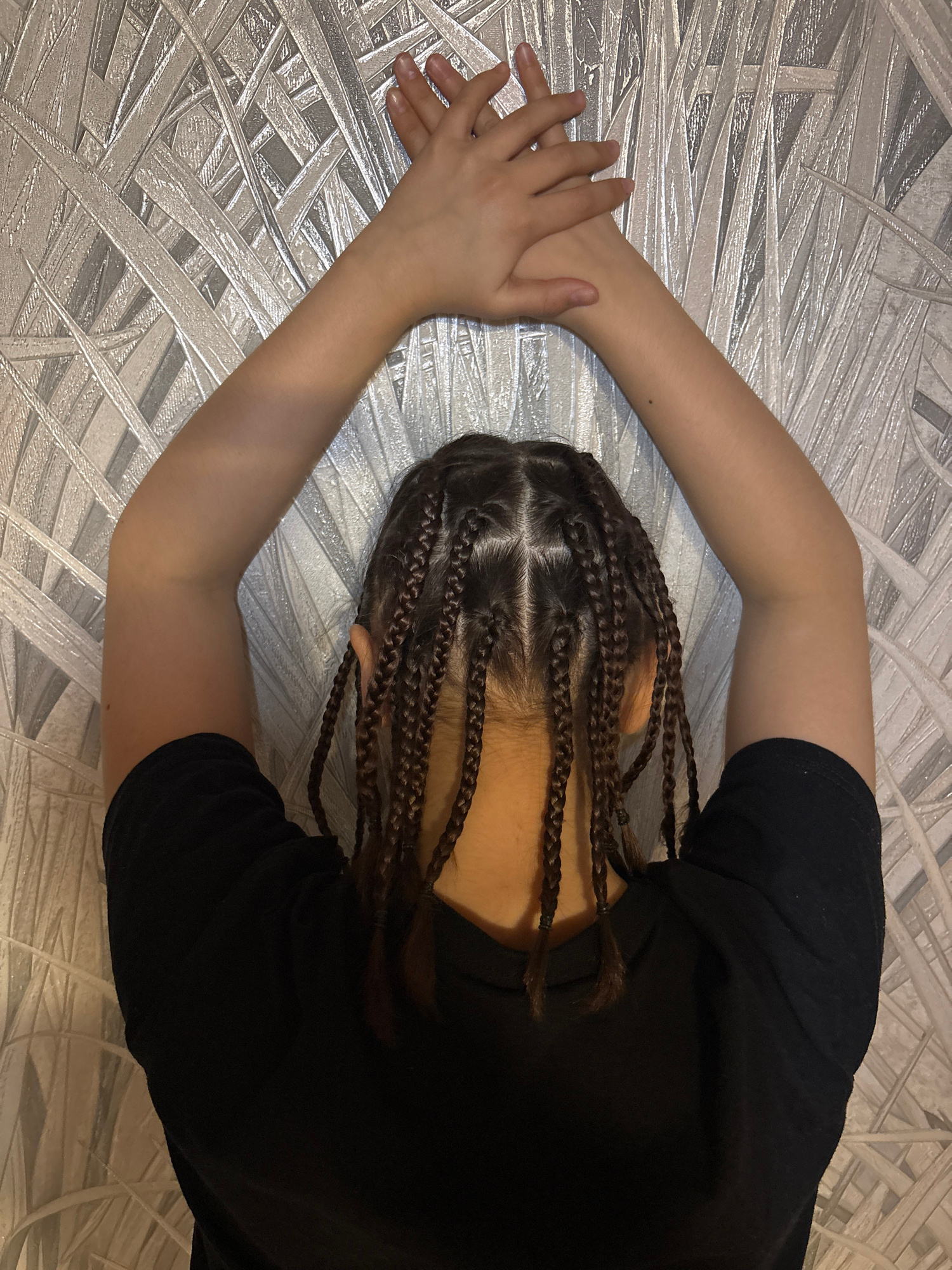 An overhead shot captures a person lying face down on a textured, patterned surface in an indoor setting in Chaikovsky, Russia. The individual is positioned with their head near the center-right of th…read more
