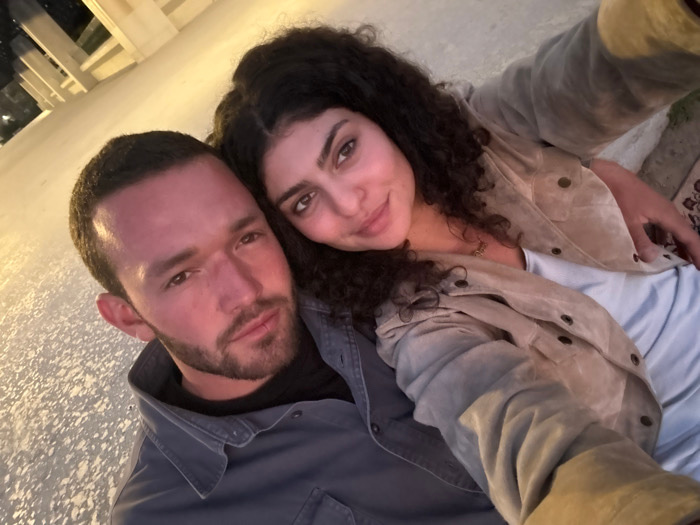 A selfie-style photograph depicts one adult male and one adult female positioned closely in the foreground against a backdrop of illuminated architectural structures. The scene is identified as the Ge…read more