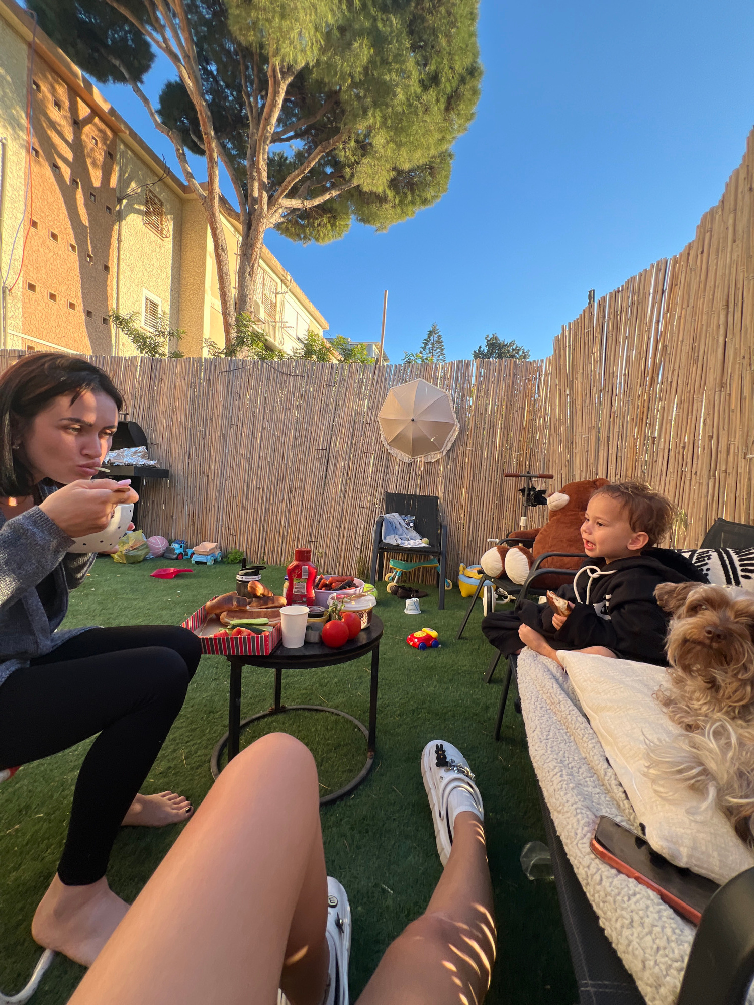 This outdoor scene, set in Al Jizah, Jordan, captures a relaxed gathering on a clear, sunny day. The image is taken from a low angle, looking upwards towards a vibrant blue sky. In the foreground, a woman with dark hair, wearing a gray sweater and black leggings, is seated on artificial green turf, taking a sip from a white mug with black polka dots. Her left foot is bare and visible. Adjacent to her, a small, round black table is laden with food items including fresh red tomatoes, a red squeeze bottle, white cups, and what appear to be sausages or hot dogs, along with slices of watermelon presented in a striped box. To the left of the table, a black grill is partially visible, and various children's toys, such as a red car, a blue car, and a striped ball, are scattered on the grass. To the right, a child with light brown curly hair, wearing a dark hooded top, is seated on a cushioned outdoor bed or chair. The child looks intently downwards at an item in their hand, possibly eating. A small, fluffy light-brown dog rests beside the child on the same cushion, and a smartphone with a pink case is also present. The bare leg and foot of another individual, adorned with a distinctive white sneaker featuring a silver chain detail, are visible nearby, casting long shadows on the turf. A tall bamboo fence forms the immediate background, acting as a privacy screen for the outdoor area. Beyond the fence, a large green tree with sprawling branches extends over a multi-story building. The building features walls in shades of yellow and orange-brown, with square-patterned windows and balconies. The bright blue sky and pronounced shadows cast by the fence and tree on the building suggest it is either late morning or afternoon. The overall atmosphere is casual and leisurely. No discernible text is visible in the image. | Open Wire