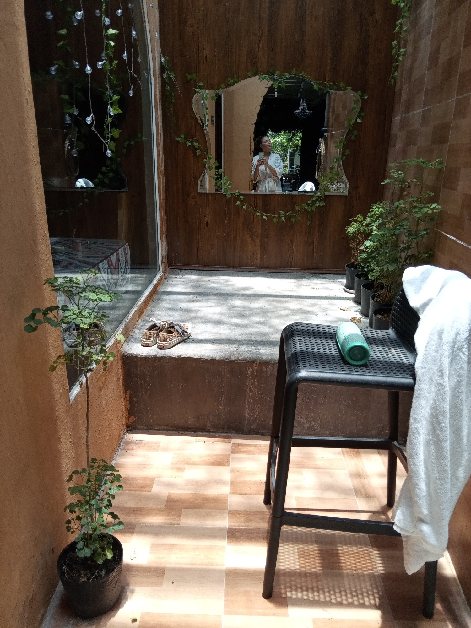 A small, tiled outdoor patio in the Bac Natural Heritage Area Trang, Vietnam, is the scene. The patio features potted plants, decorative lights, and a mirror. A black stool sits in the foreground, upo…read more
